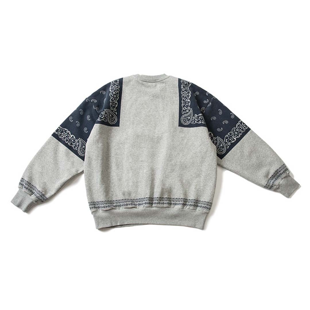Classic pullover sweater in heather grey with patchwork paisley shoulder and ribbed elastic cuffs and hem.
