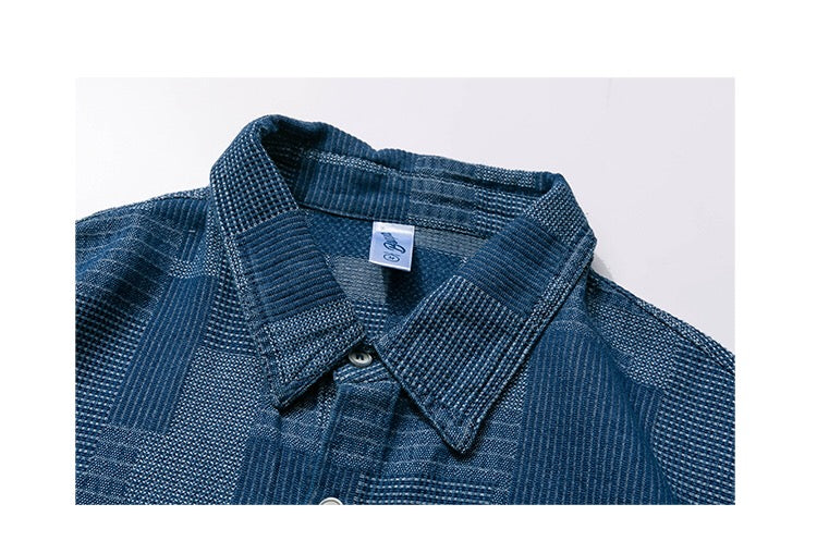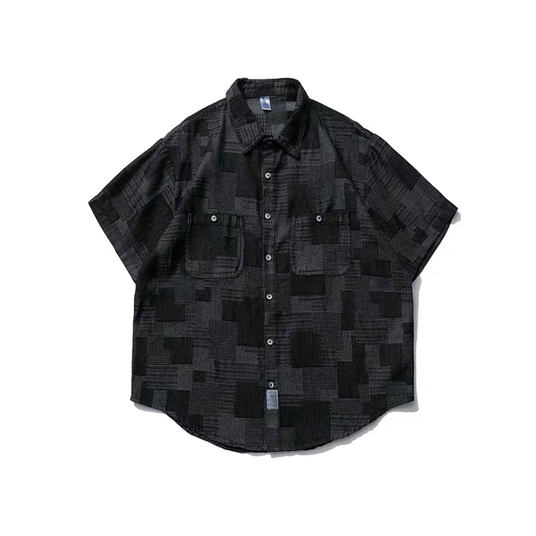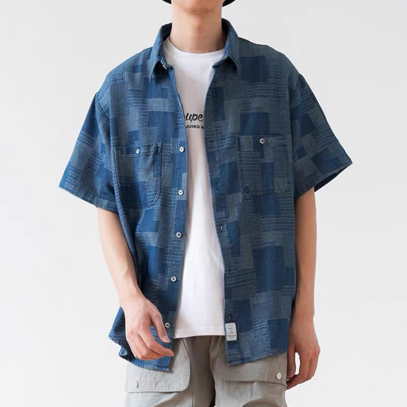 Patchwork denim like short-sleeved shirt with front pockets. Textured.