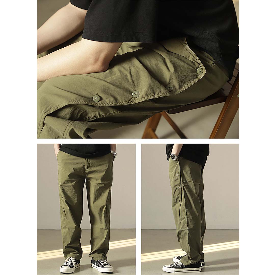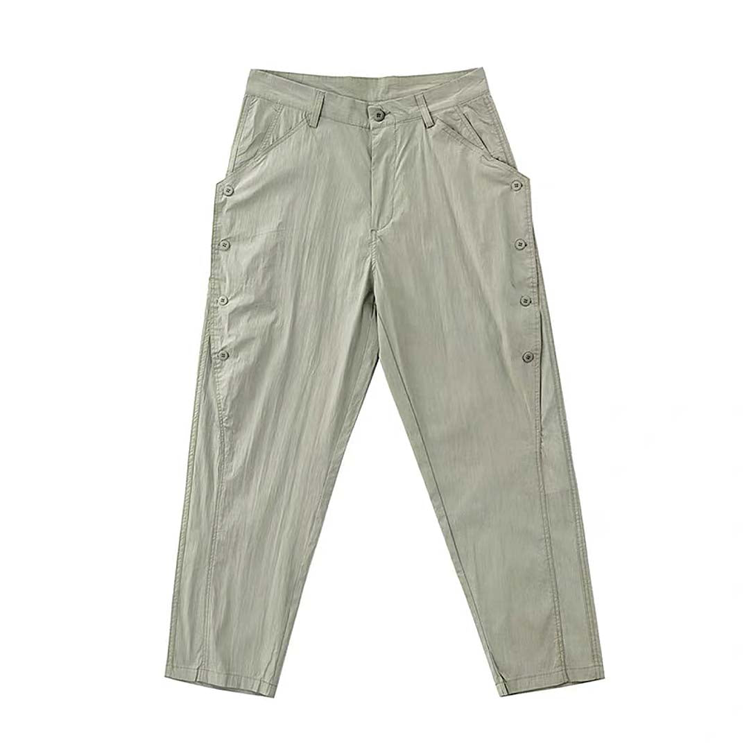 A casual workwear trousers in a textured washed effect fabric with side buttoned detail. Available in Mint, Olive and Black.