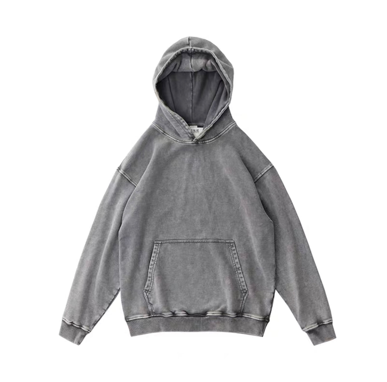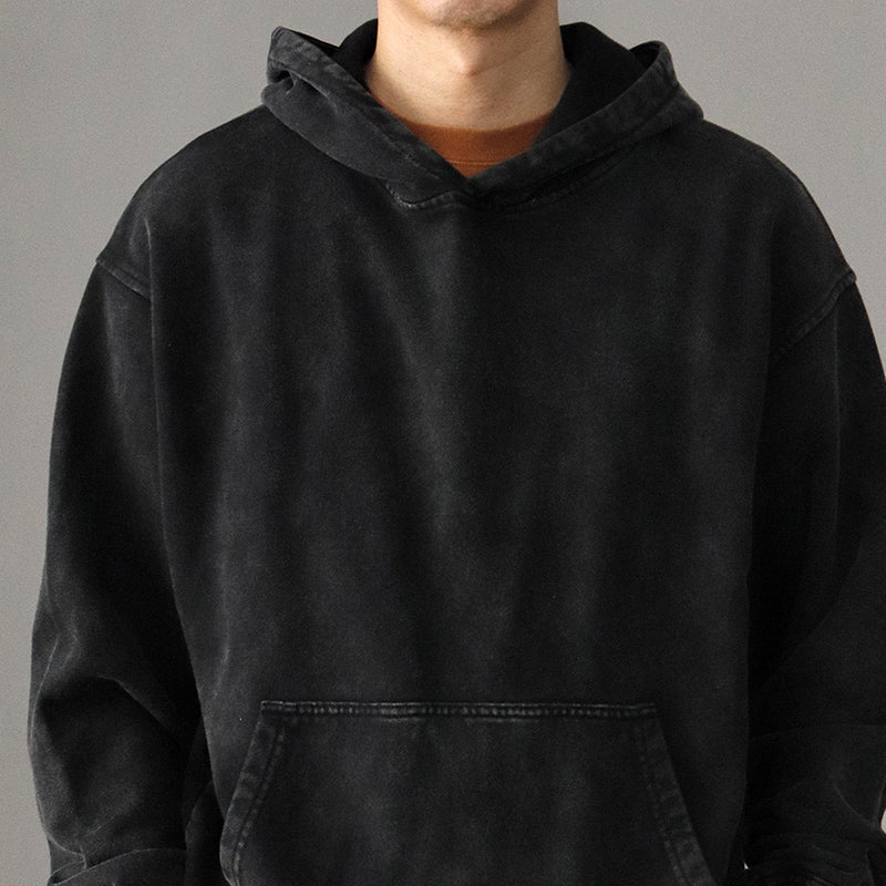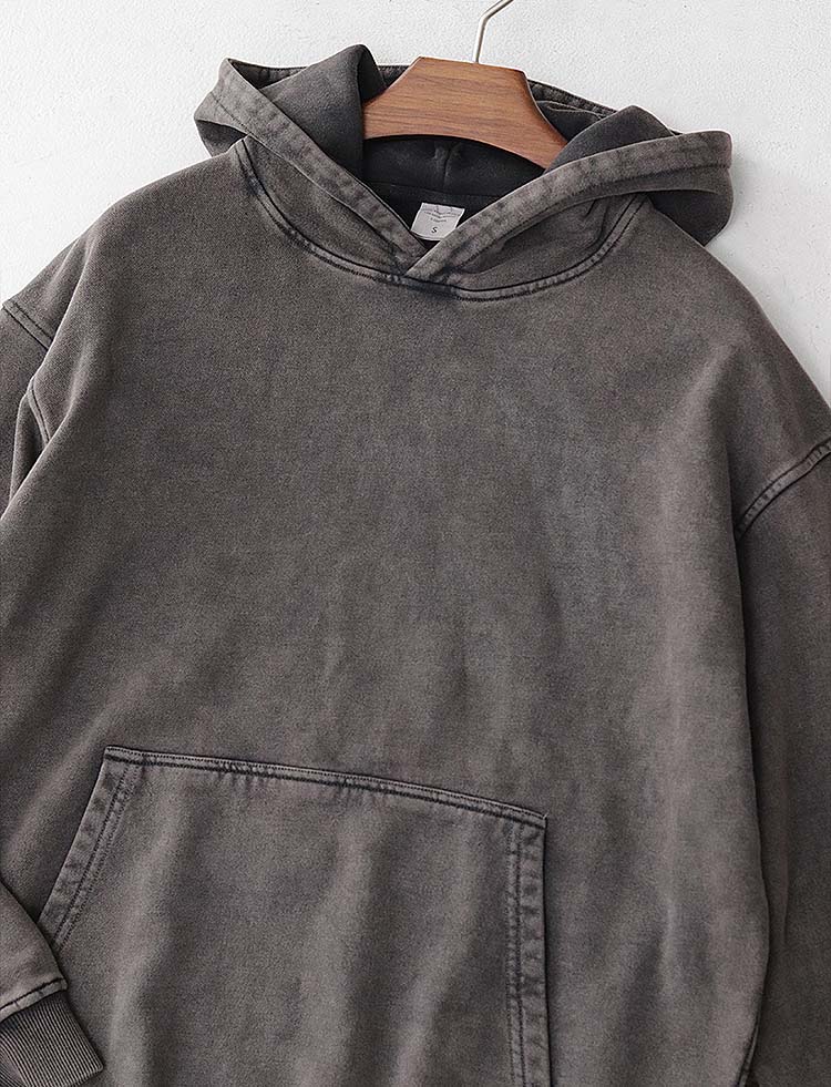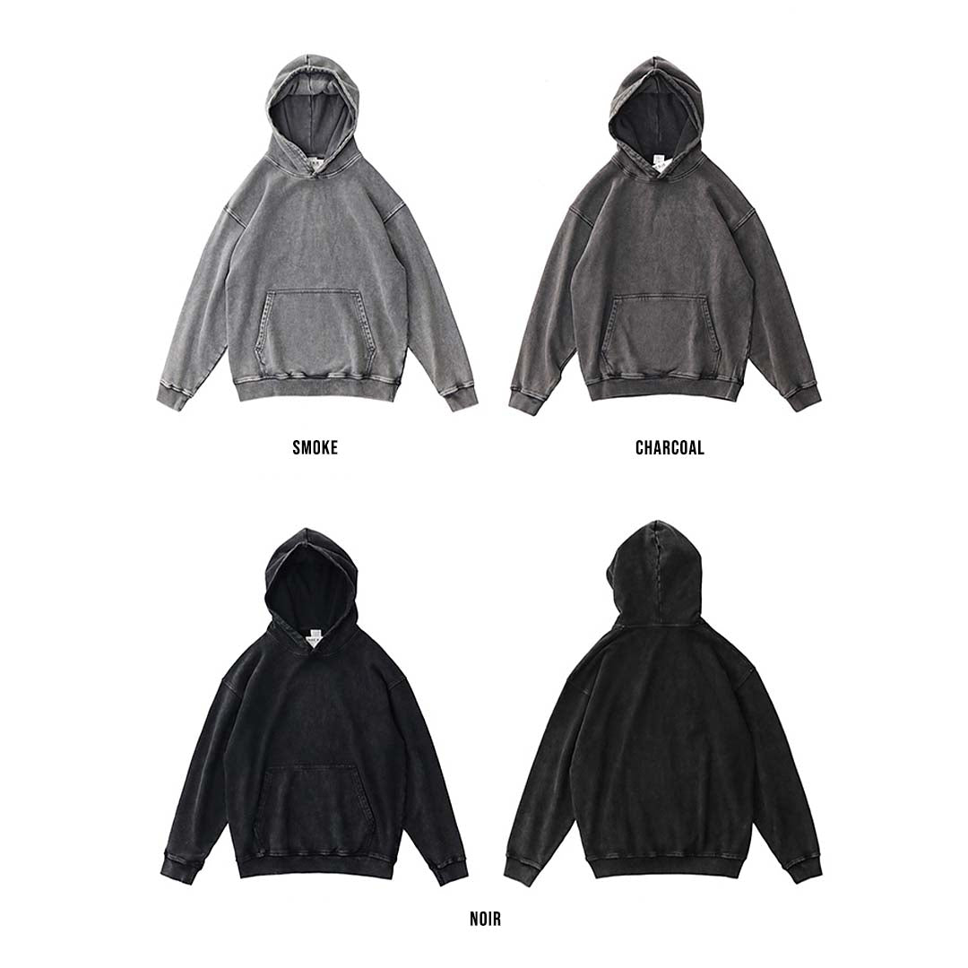 Basic hoodie silhouette with a washed fabric effect. Now available in 3 monochromatic colorways.