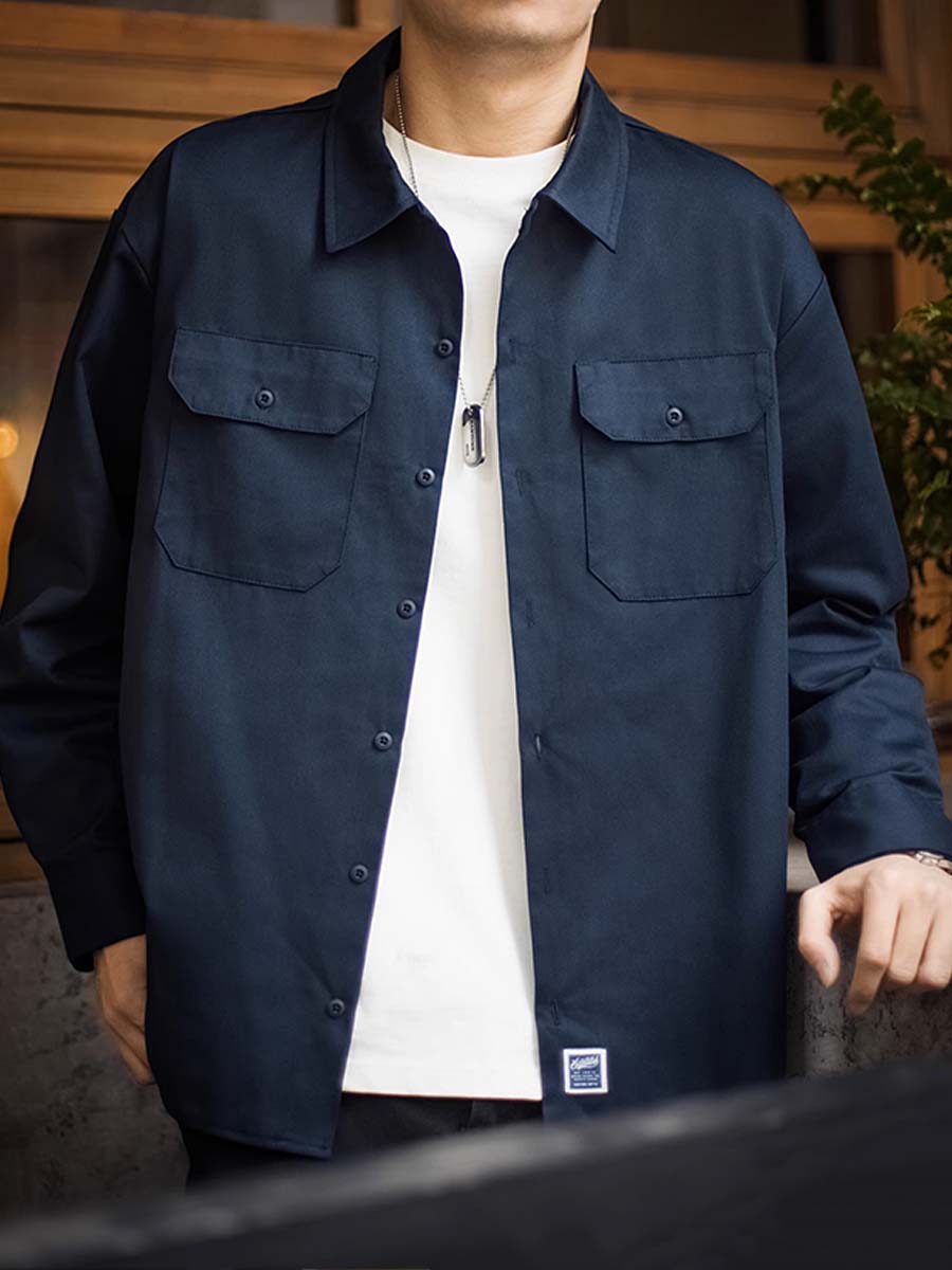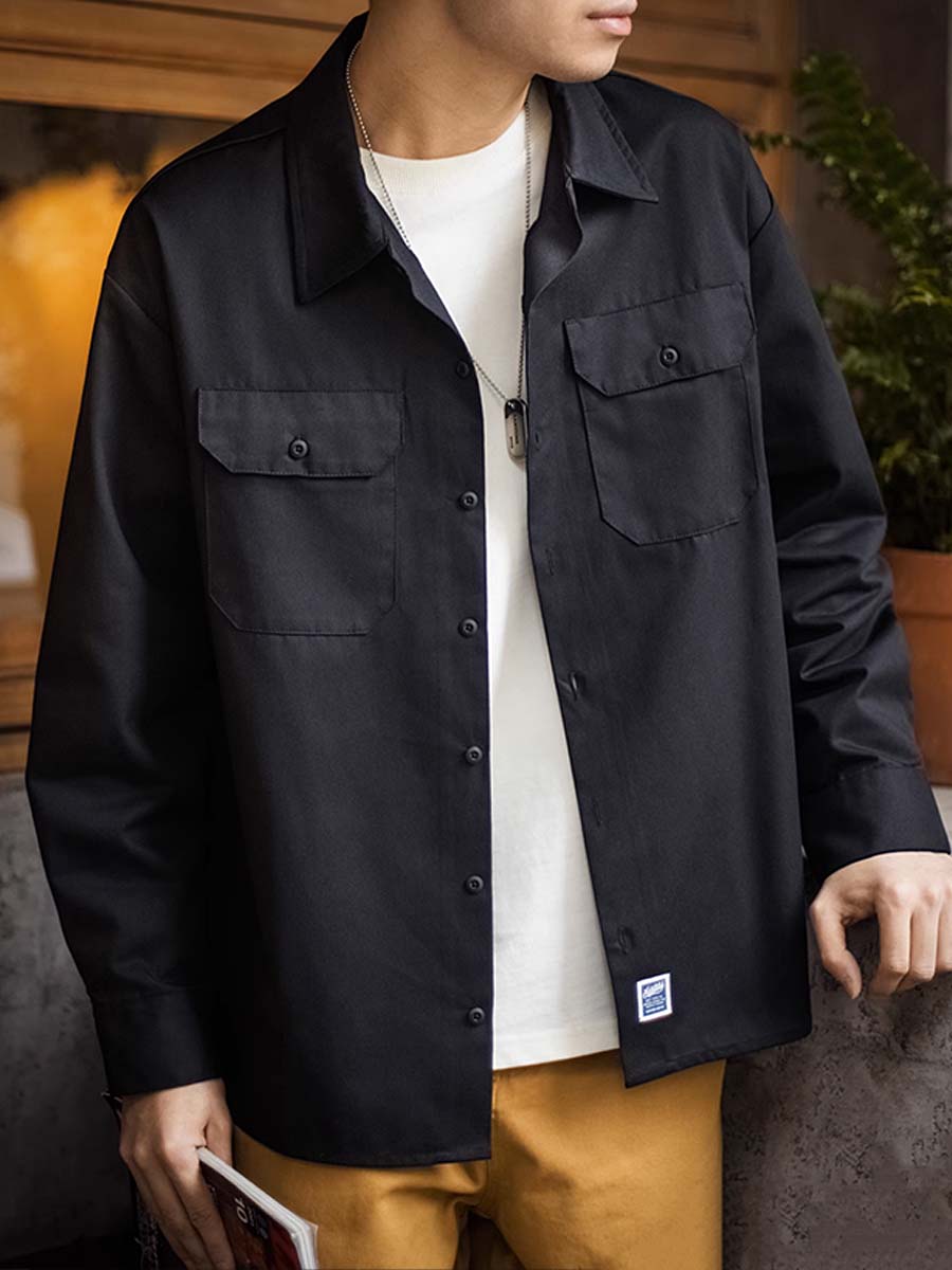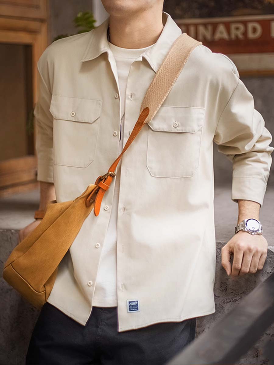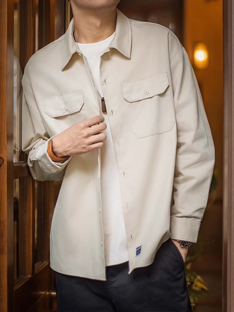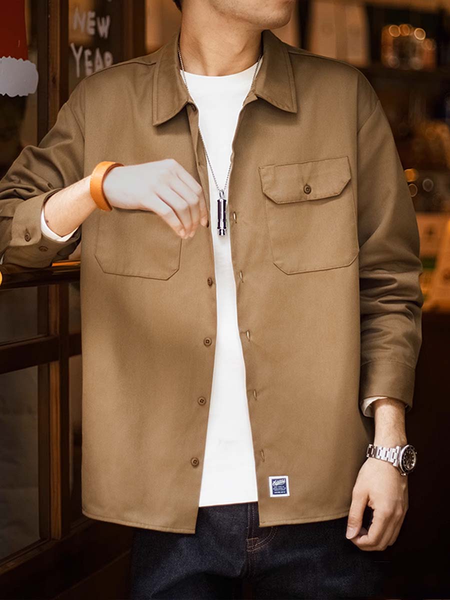 Solid coloured buttoned over shirt with convenient and functional pocket.