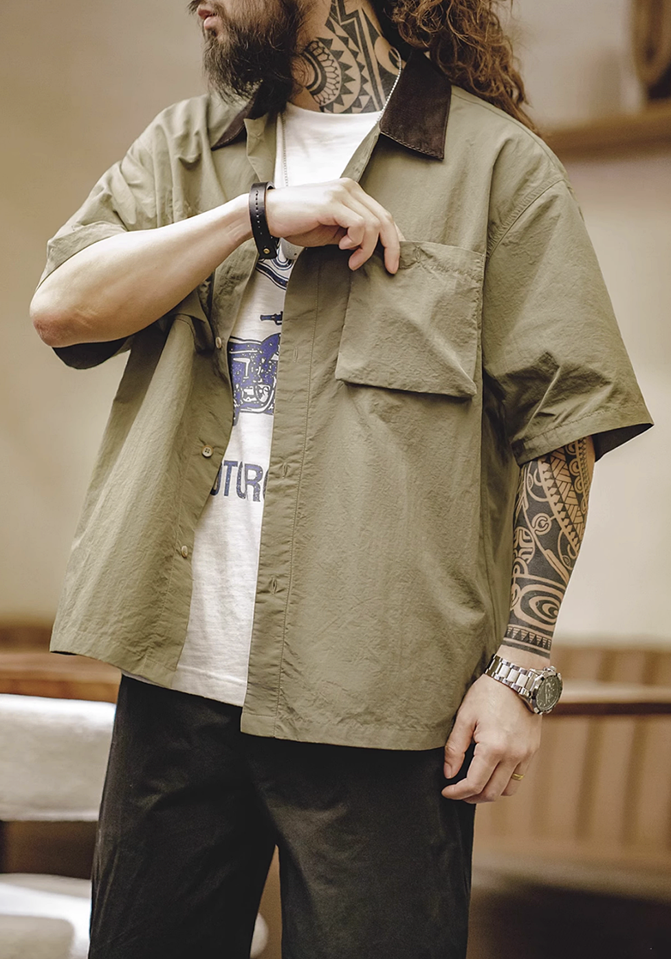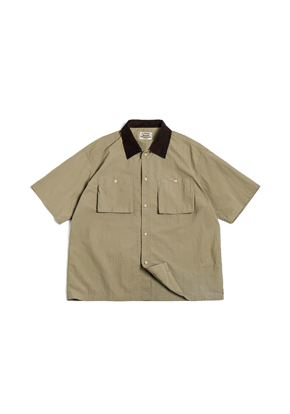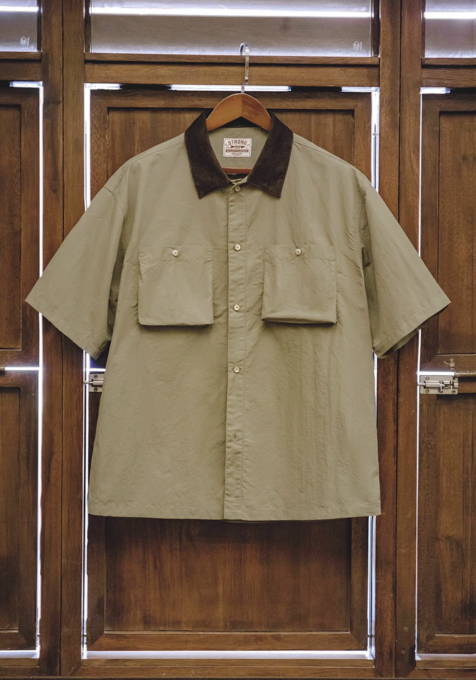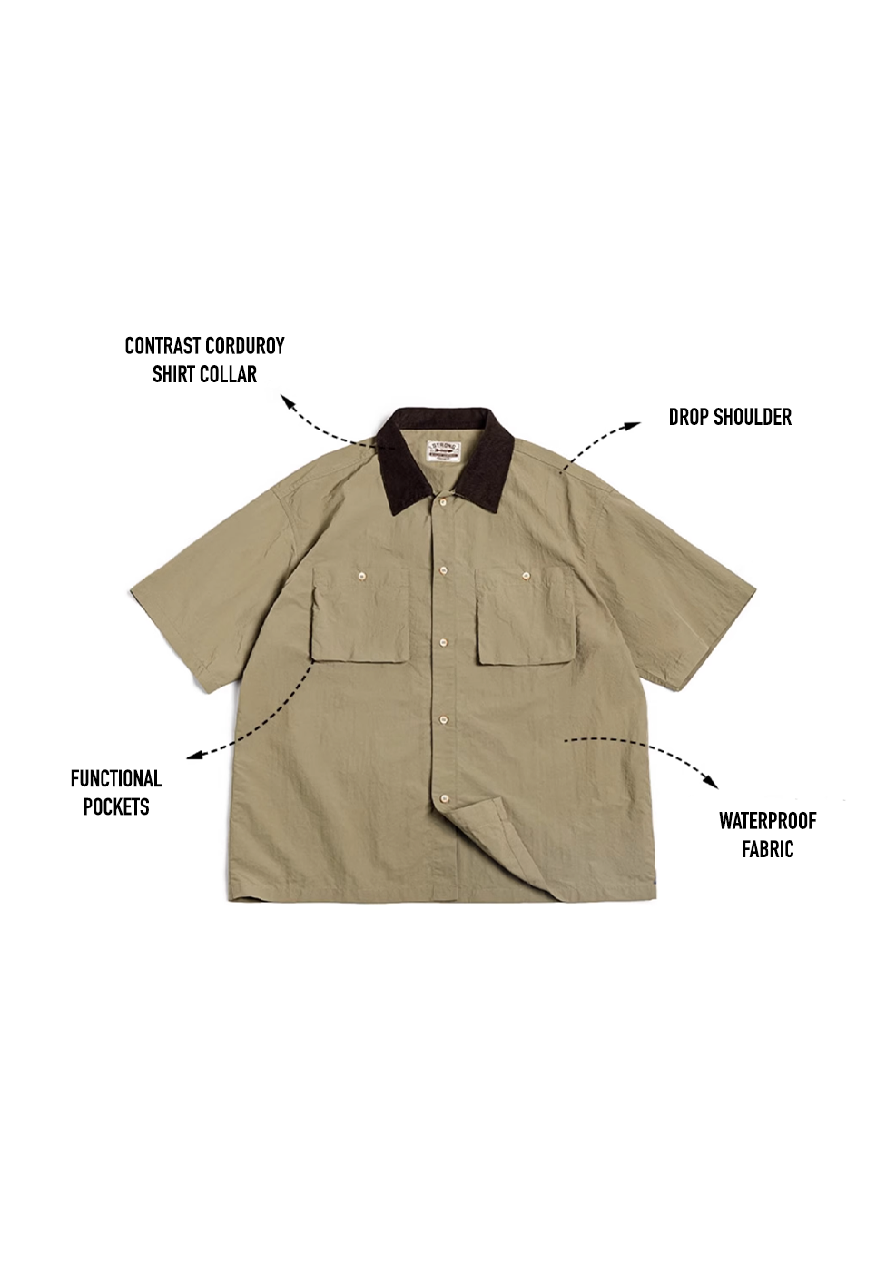 Short sleeve outdoor urban workwear shirt with functional pockets and contrast corduroy shirt collar.