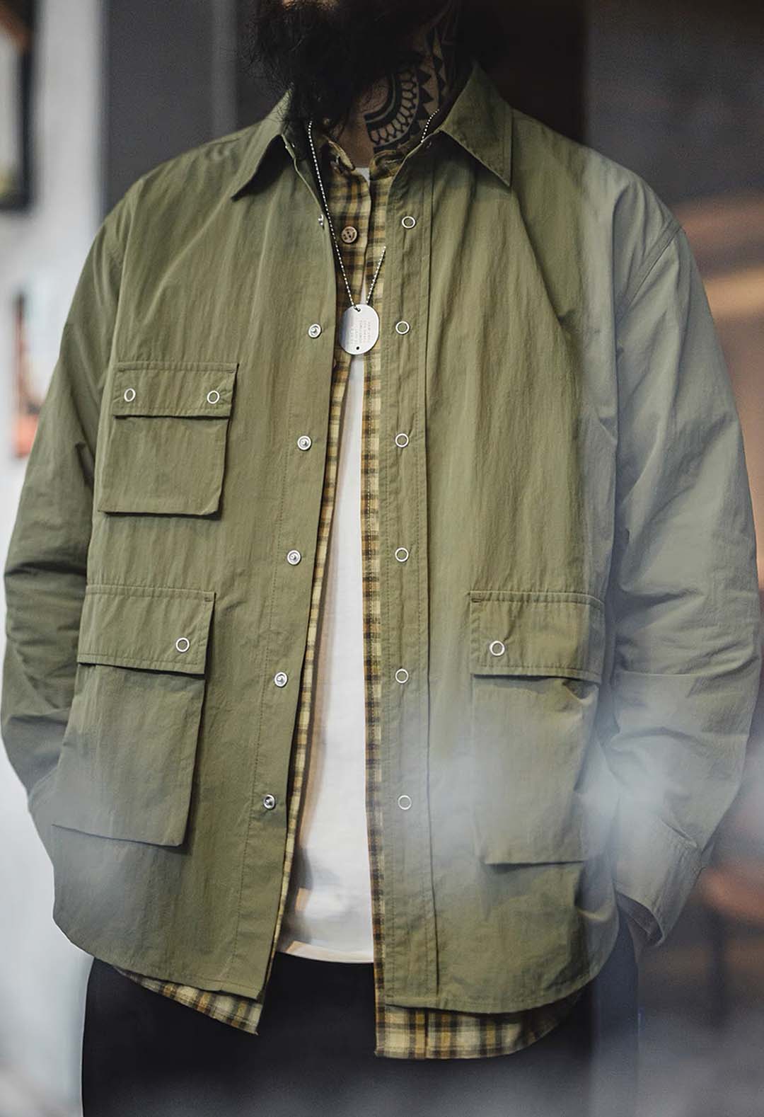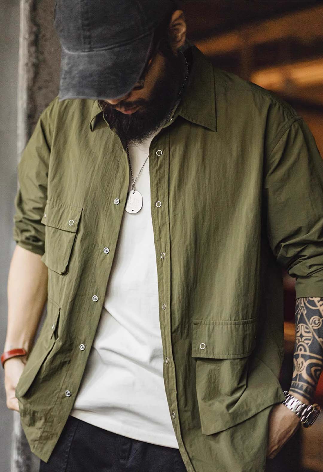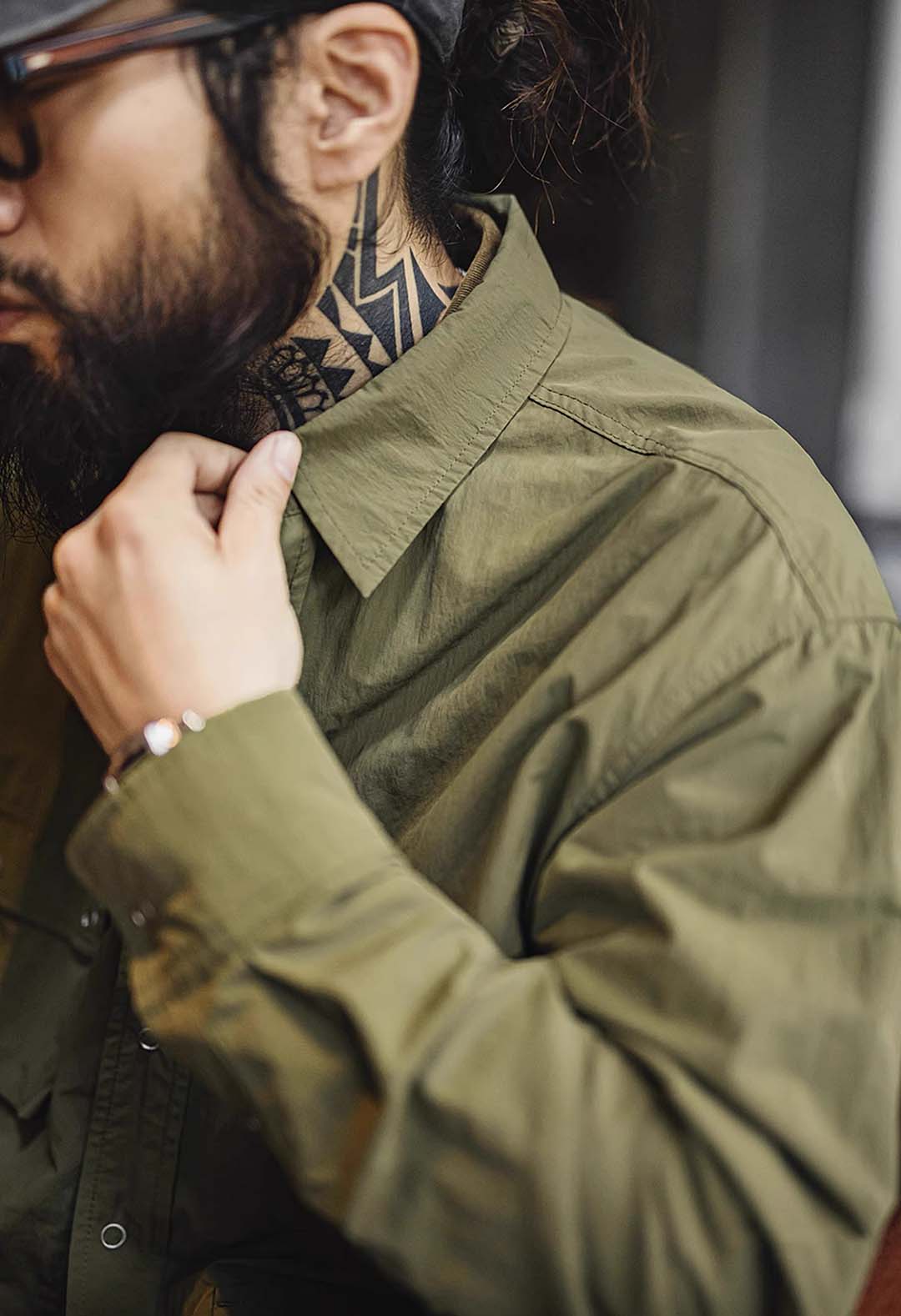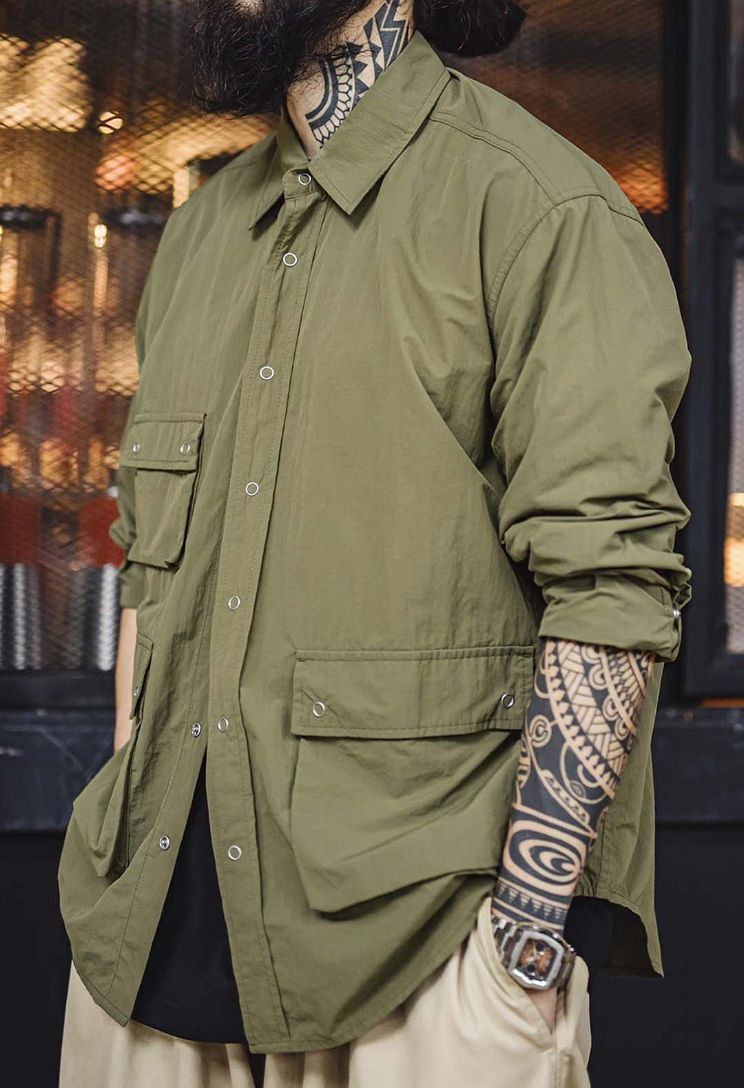 An outdoor relaxed workwear long-sleeved shirt with functional utilitarian details. Available in army green.