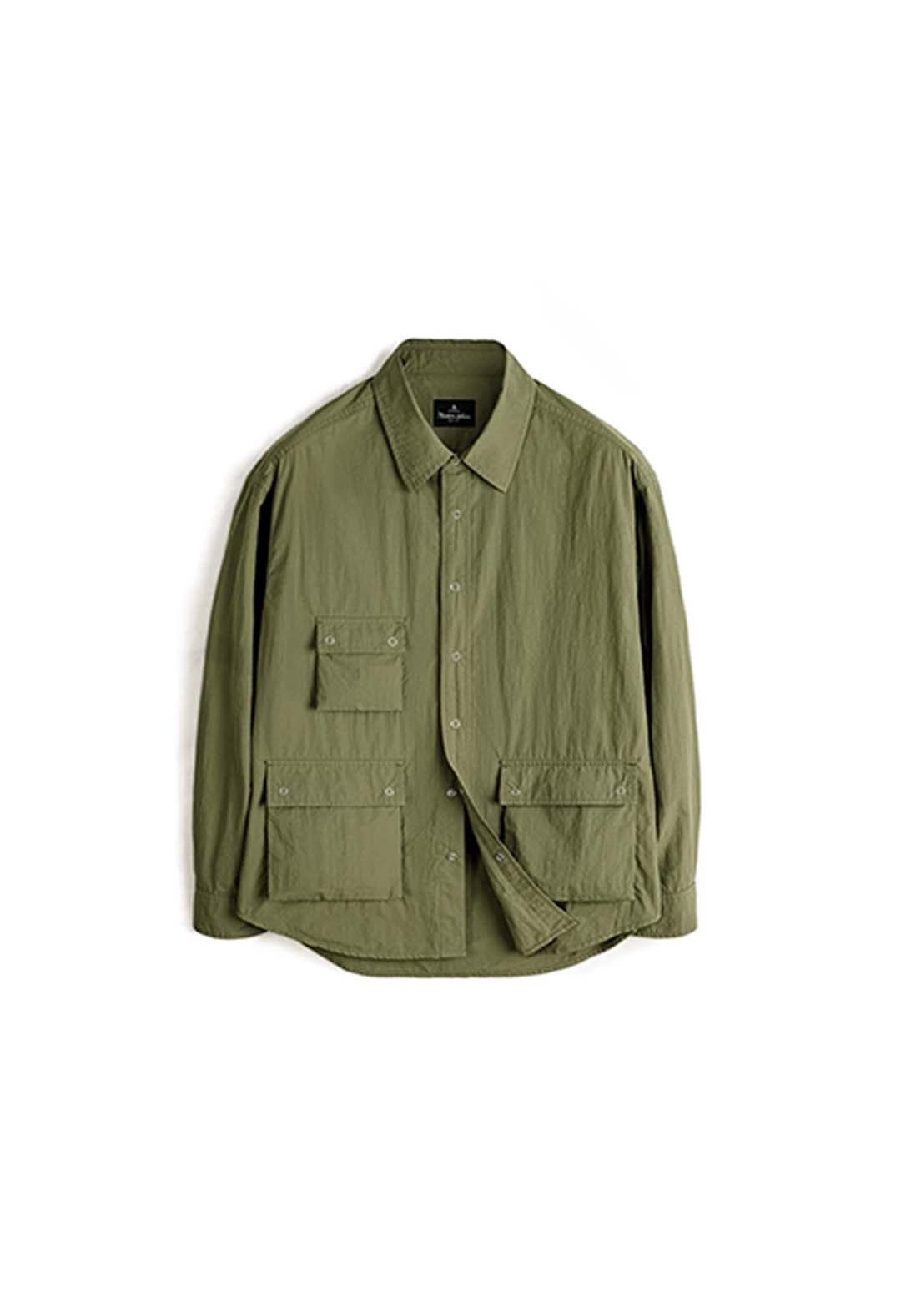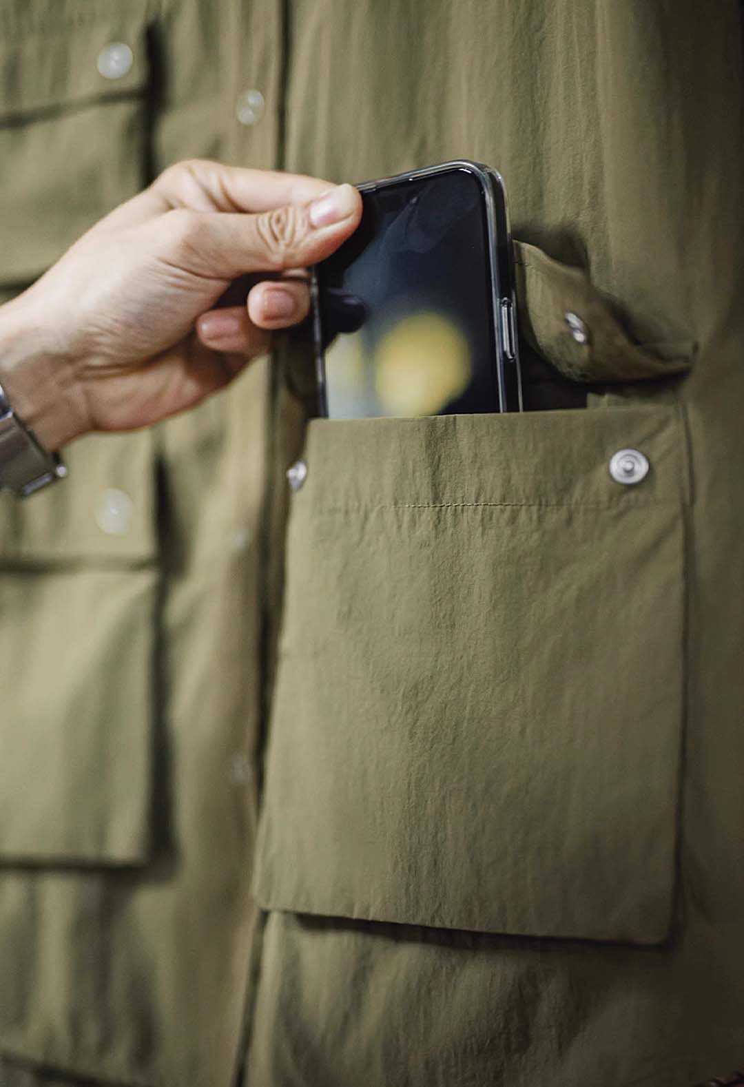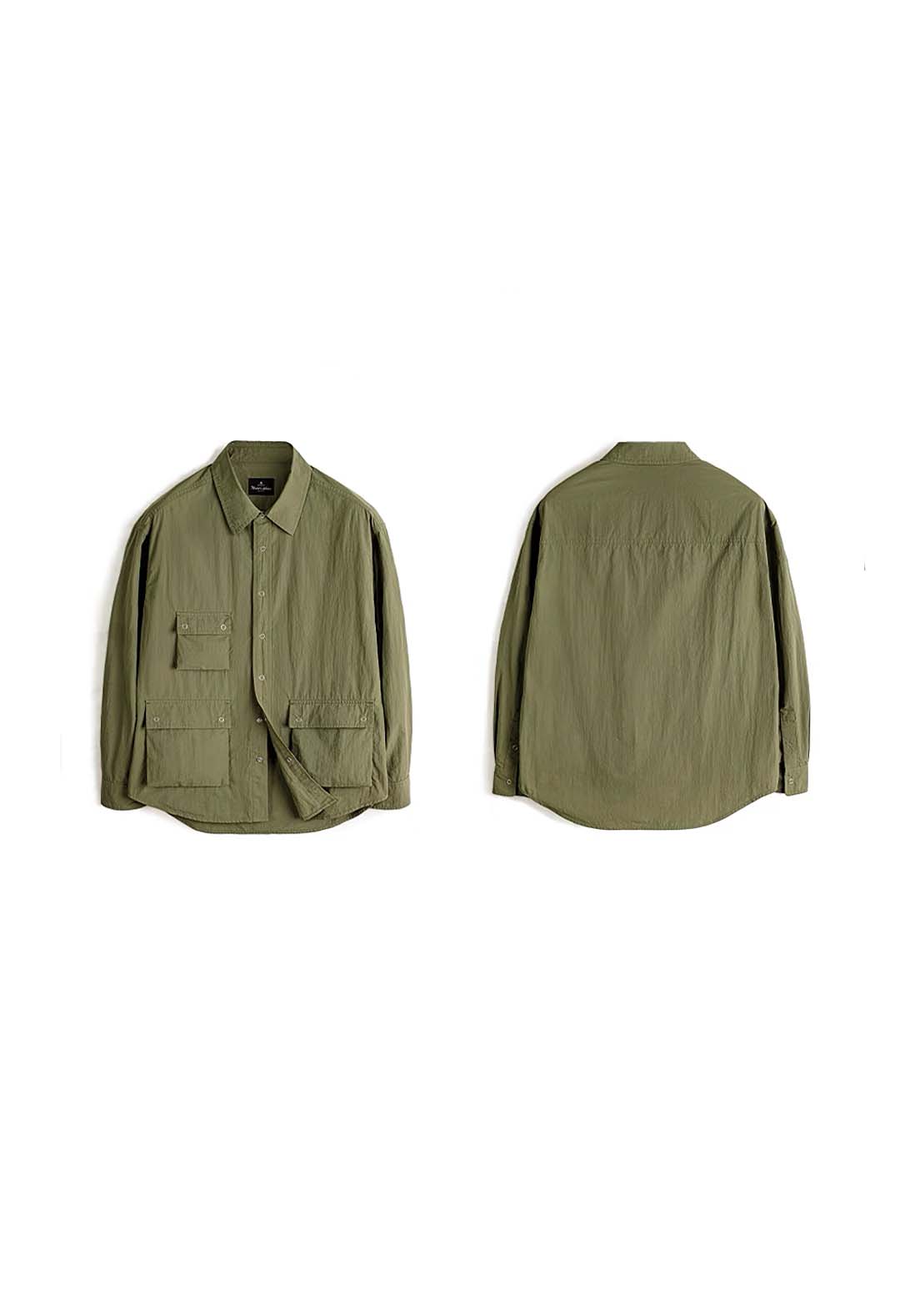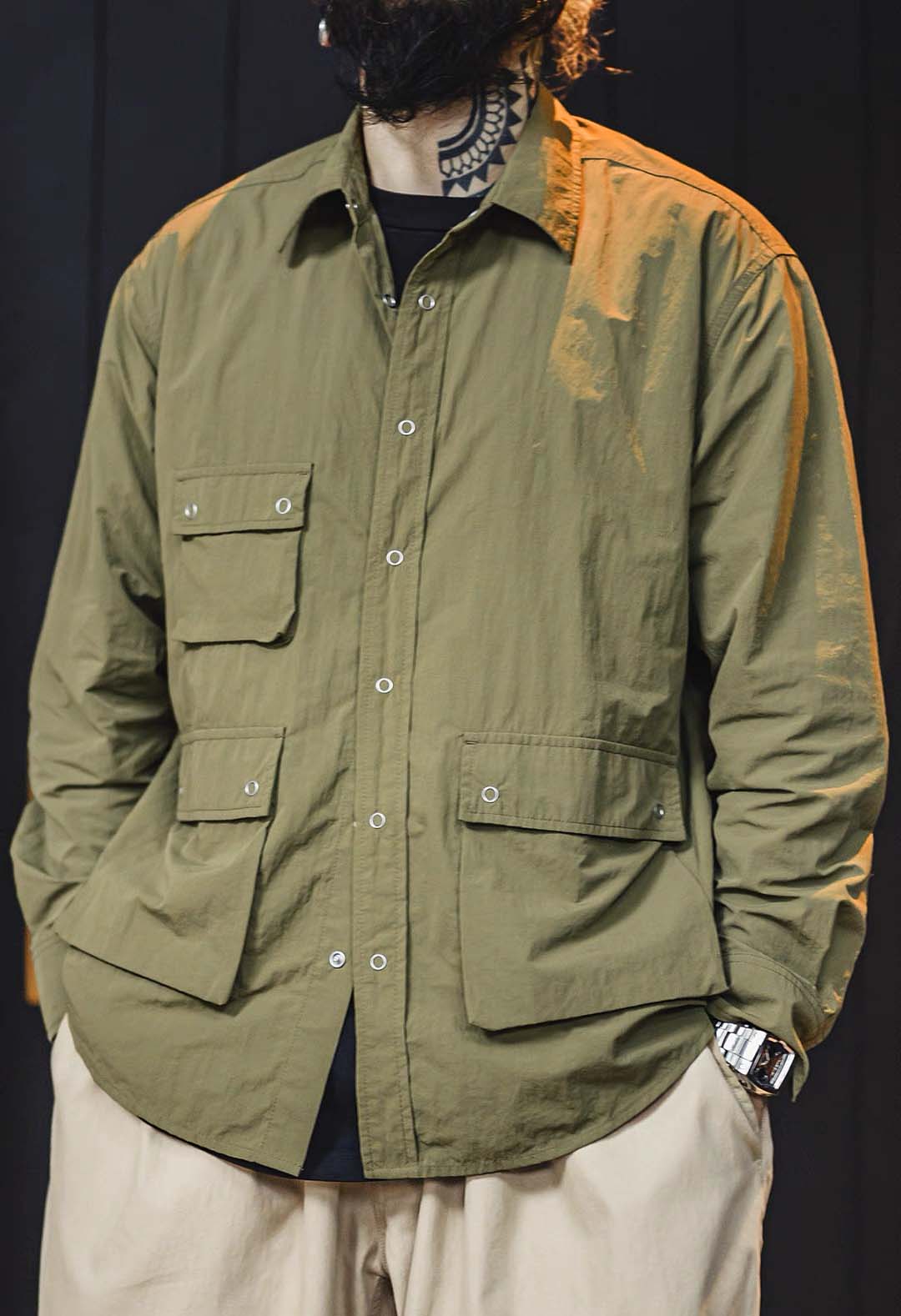 An outdoor relaxed workwear long-sleeved shirt with functional utilitarian details. Available in army green.