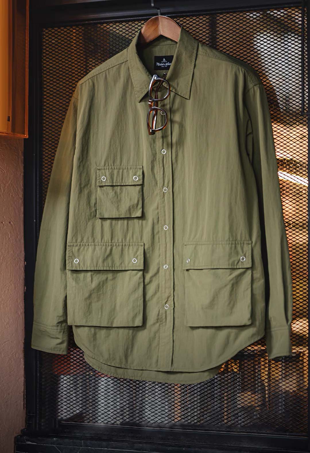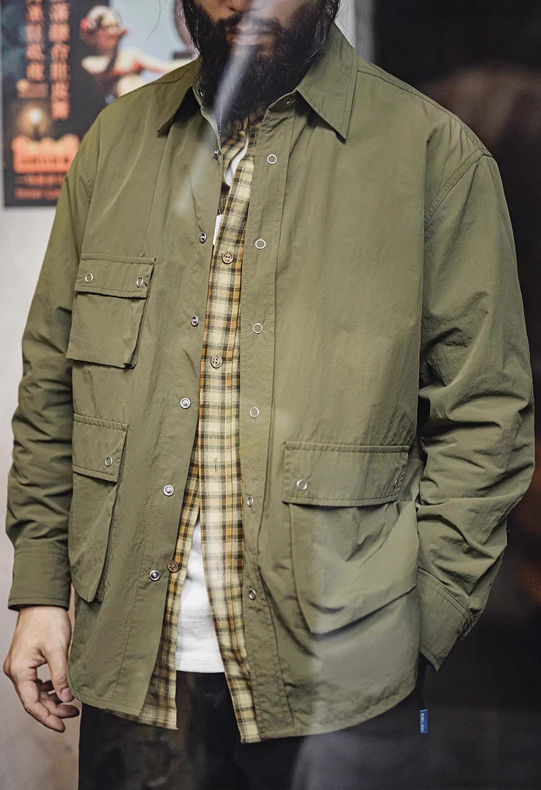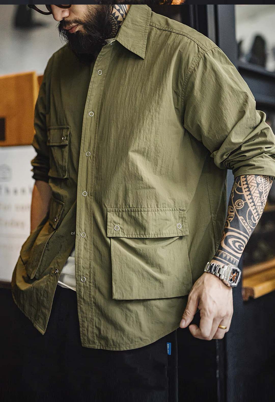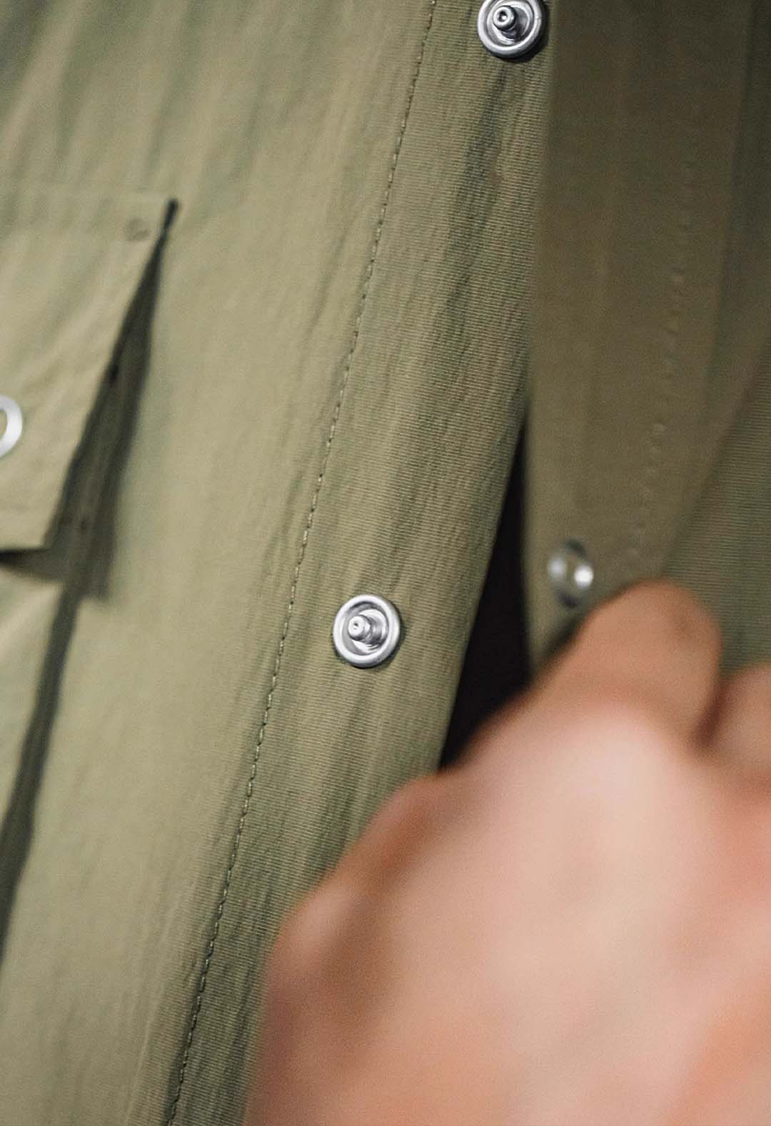 An outdoor relaxed workwear long-sleeved shirt with functional utilitarian details. Available in army green.