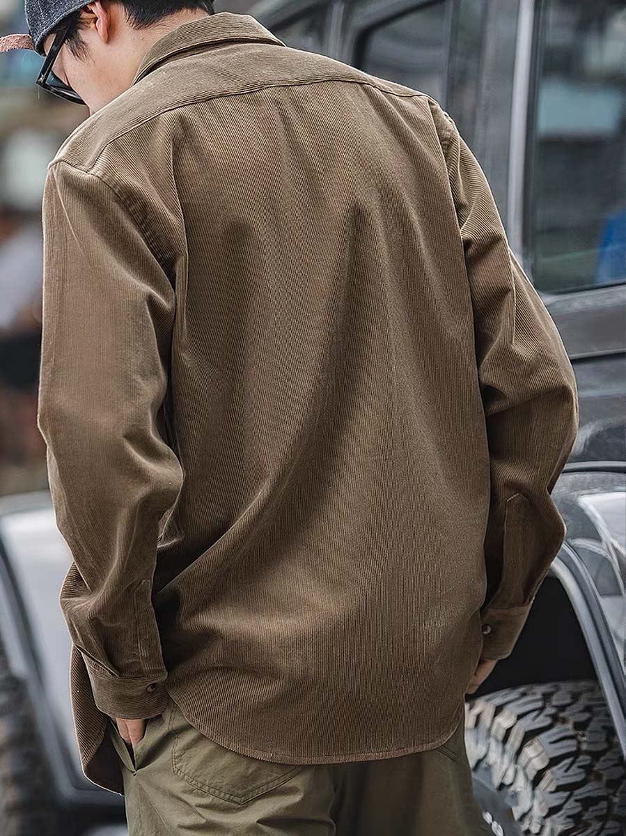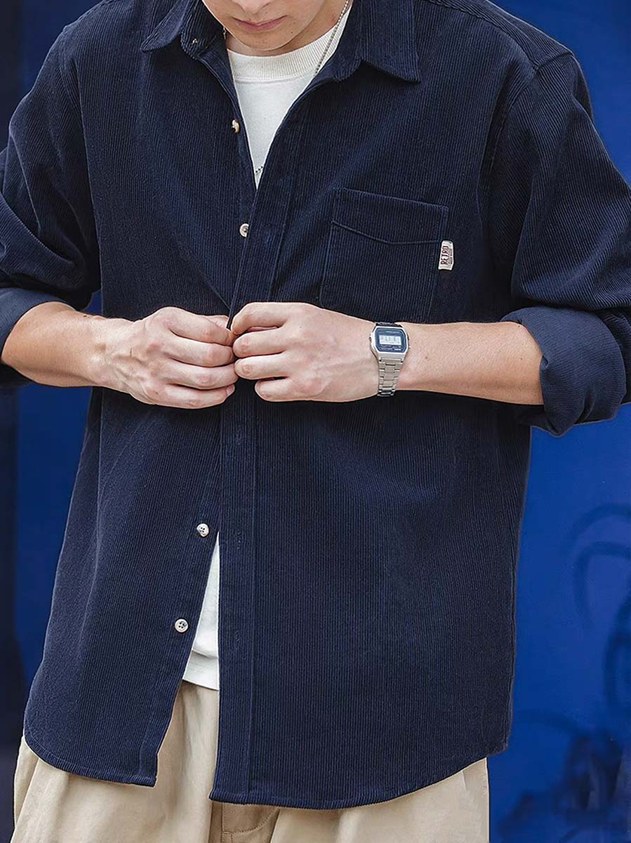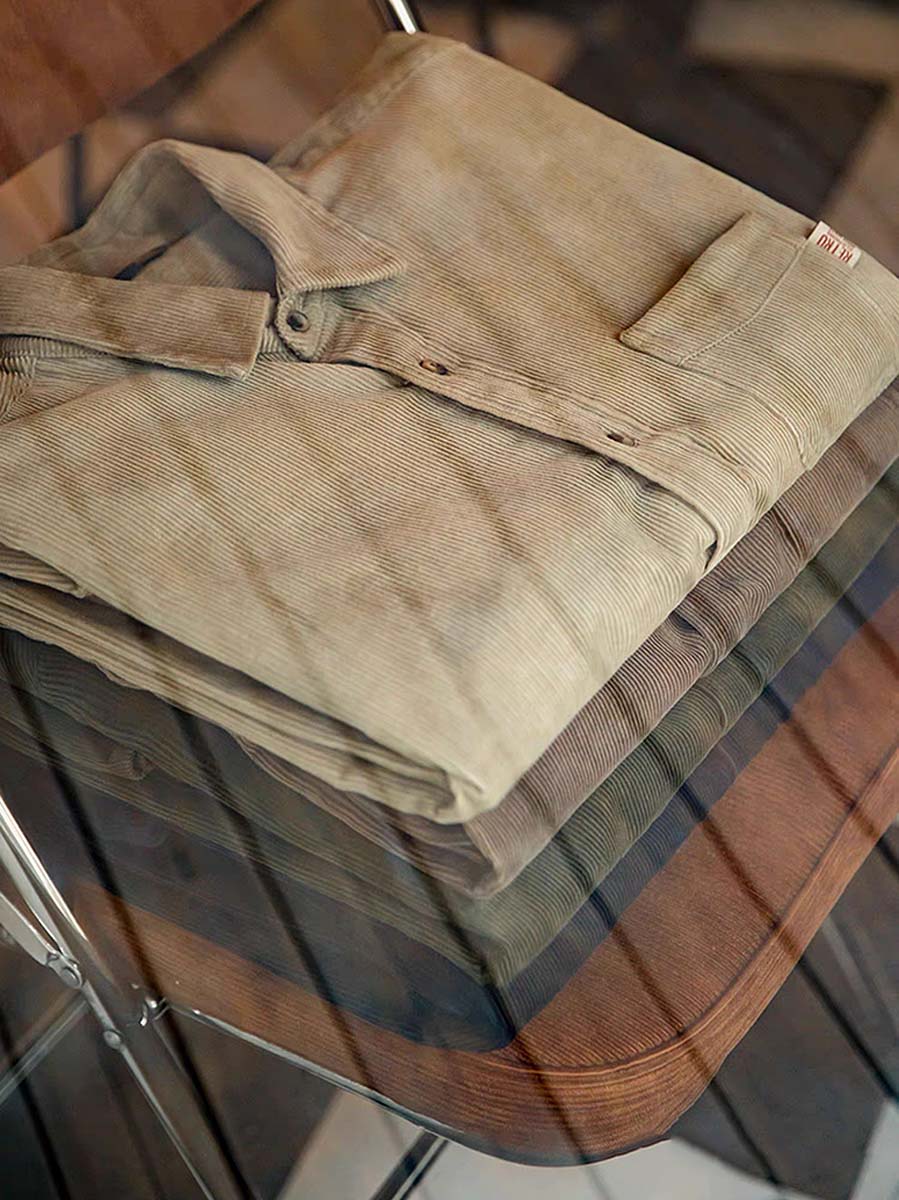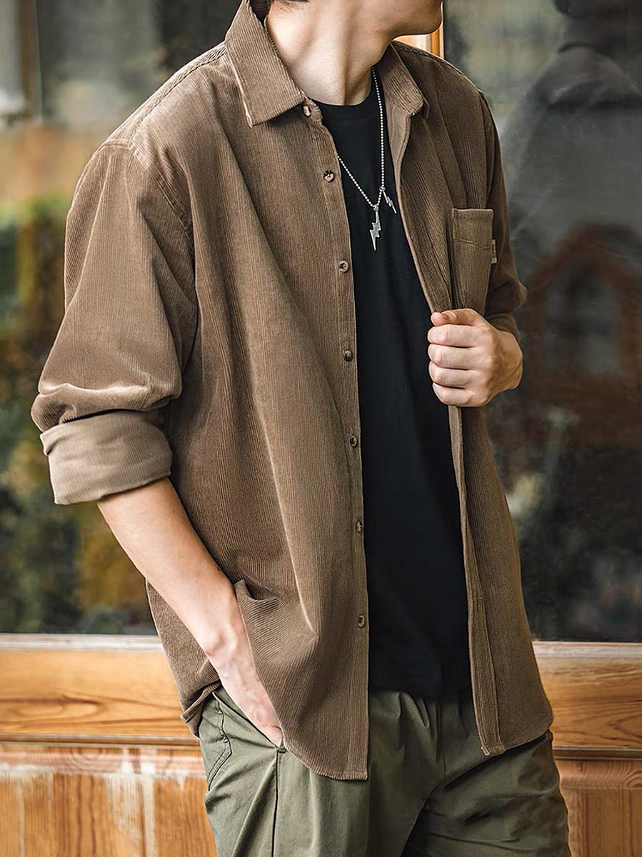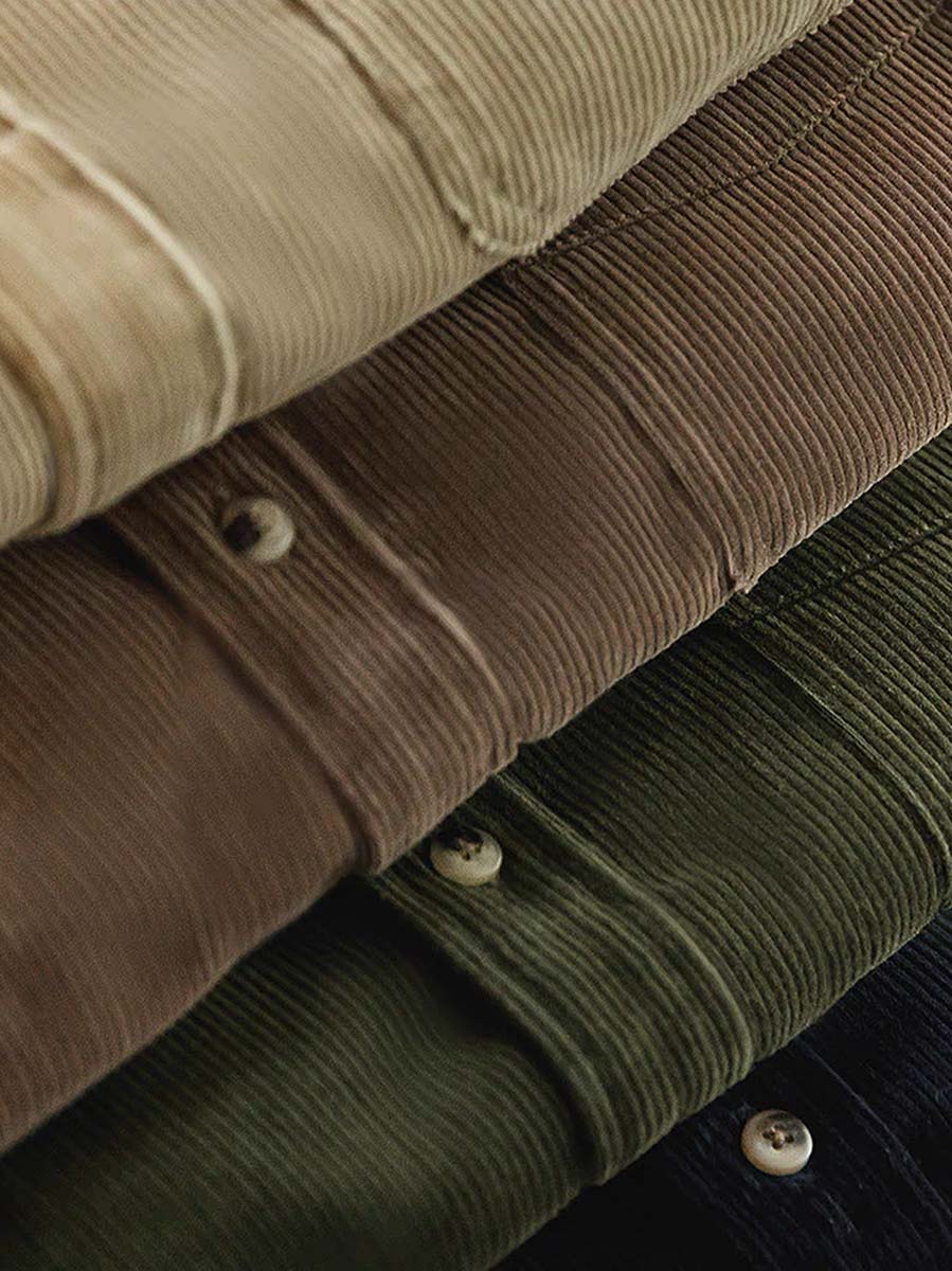 Smart casual long-sleeved shirt in textured corduroy. Available in Army Green, Navy, Brown and Sand.