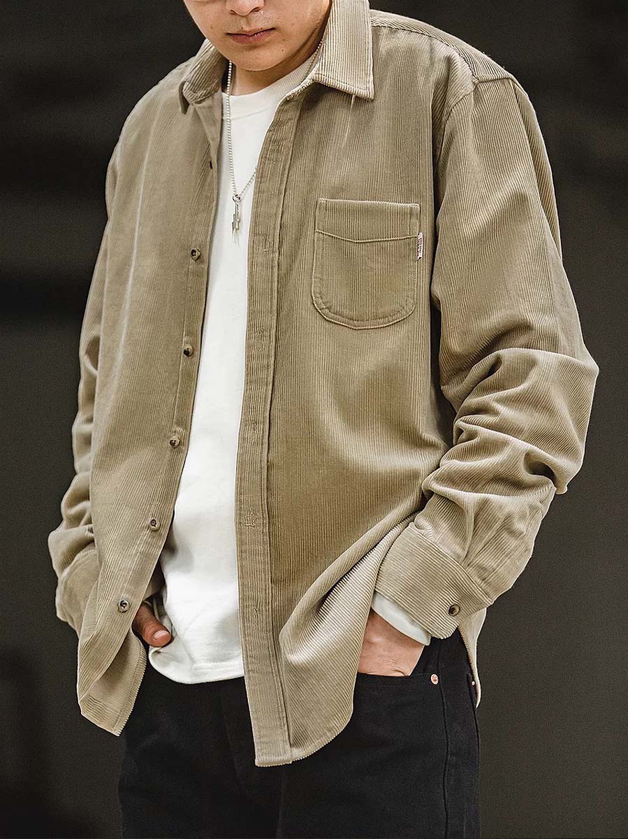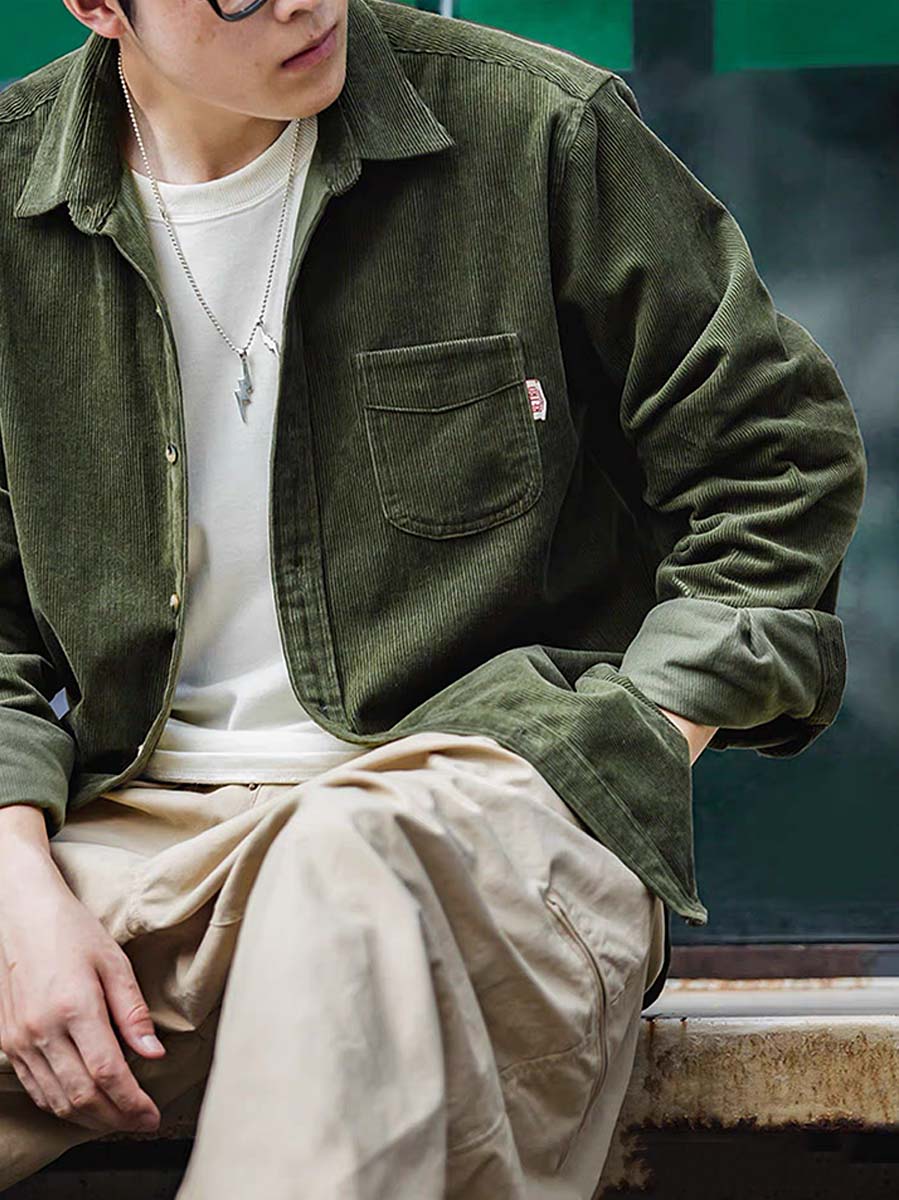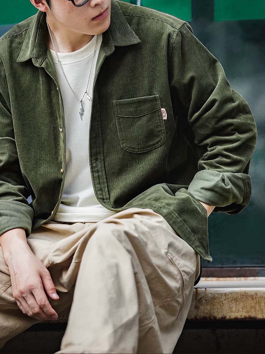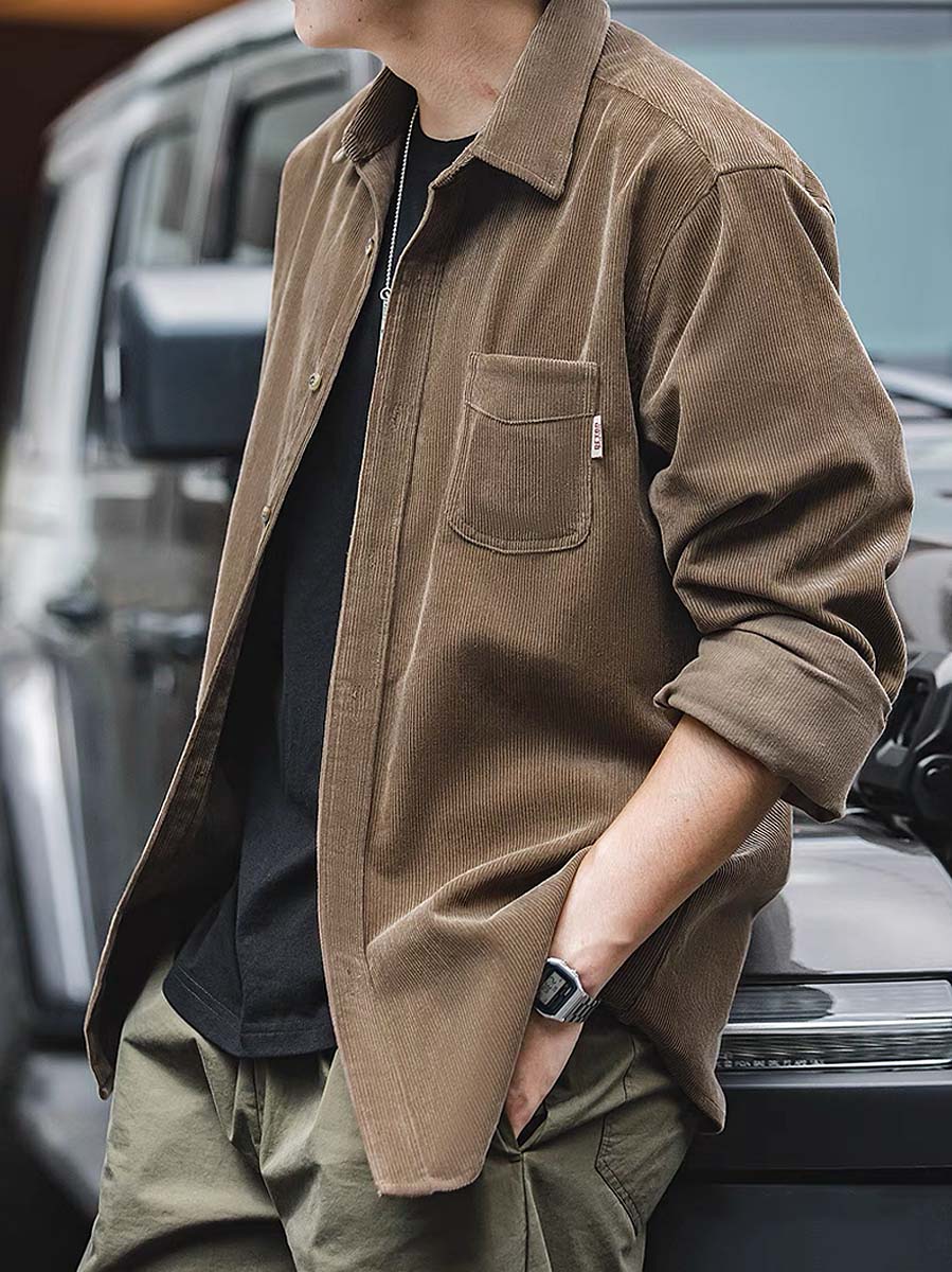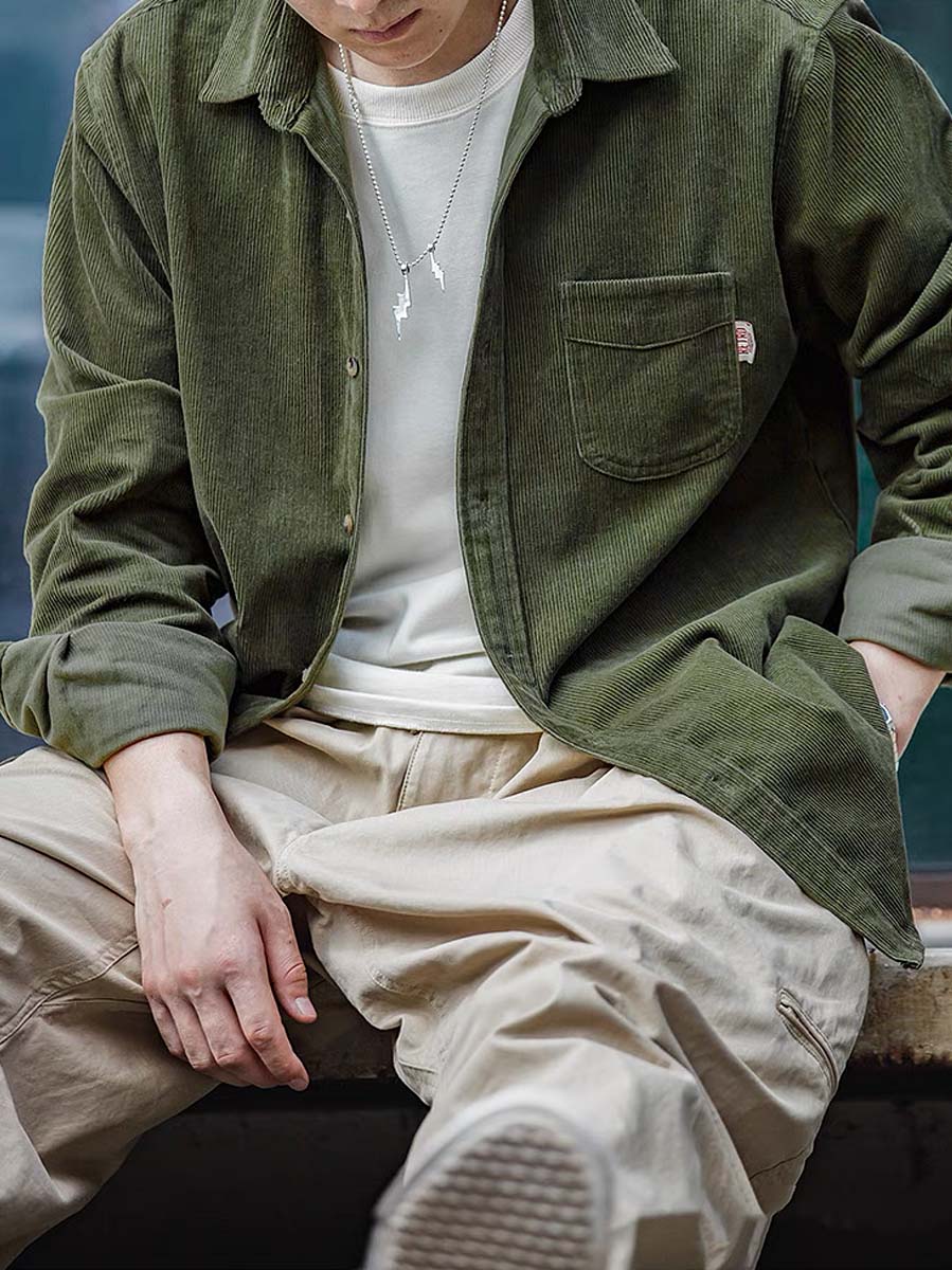 Smart casual long-sleeved shirt in textured corduroy. Available in Army Green, Navy, Brown and Sand.