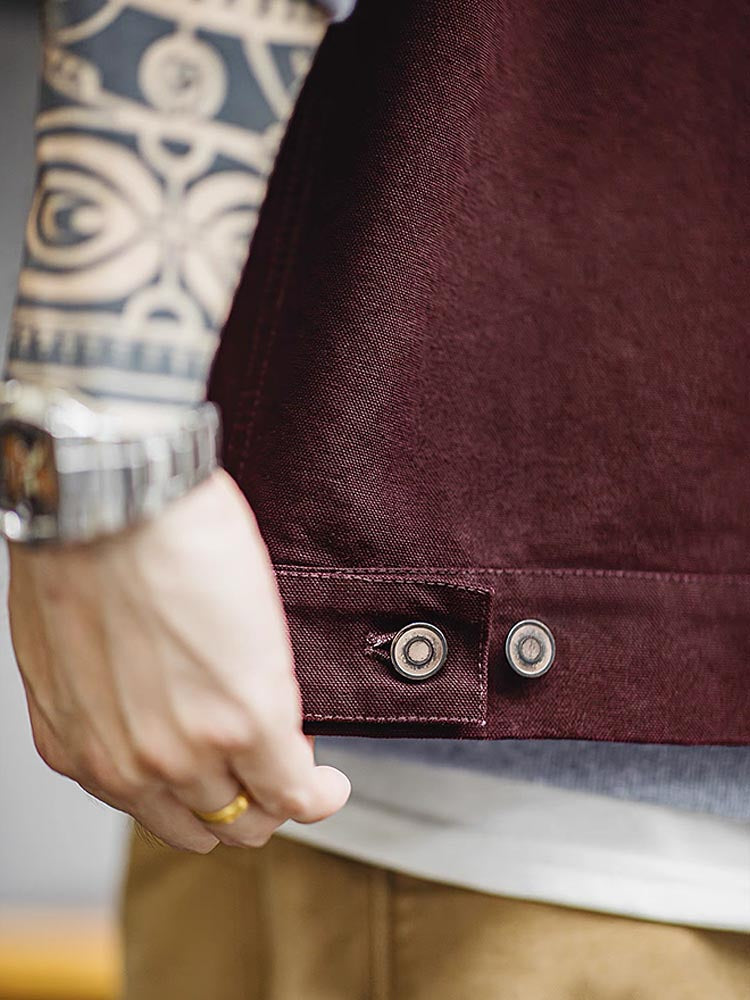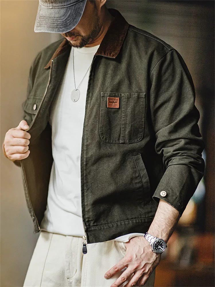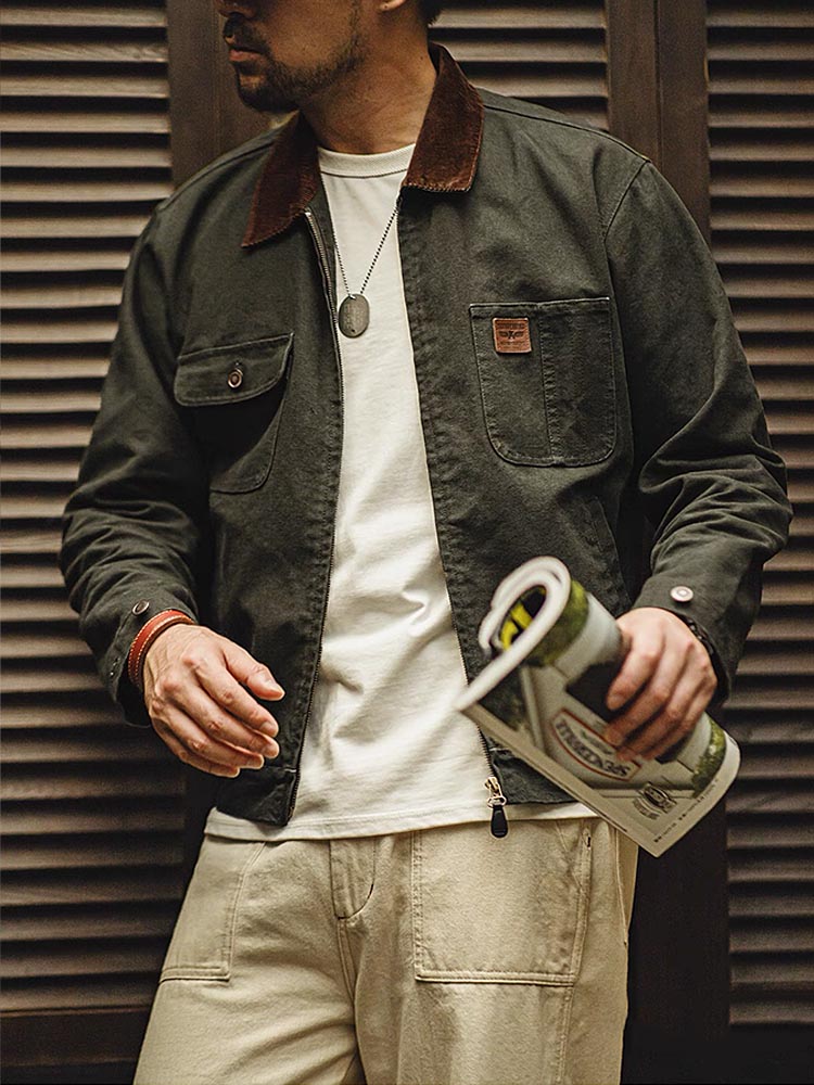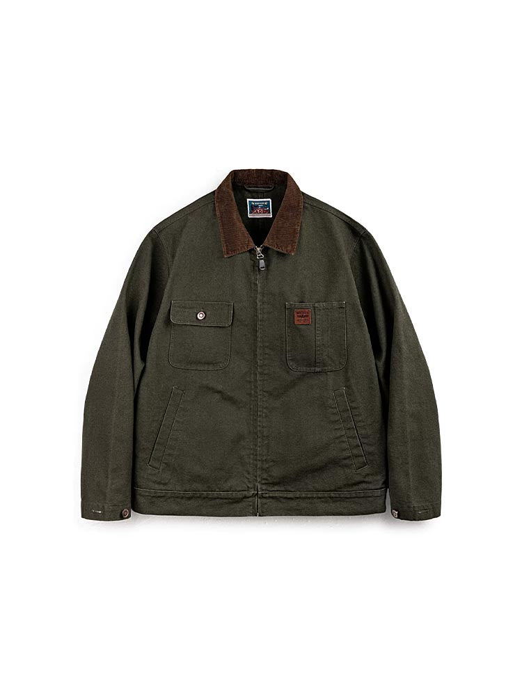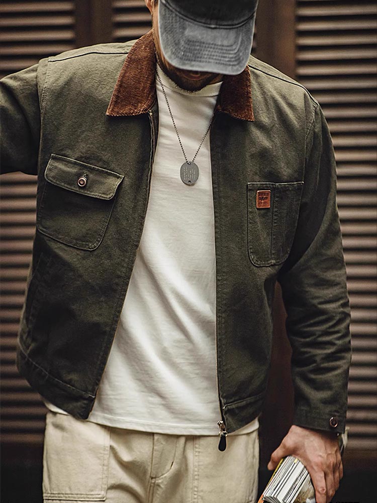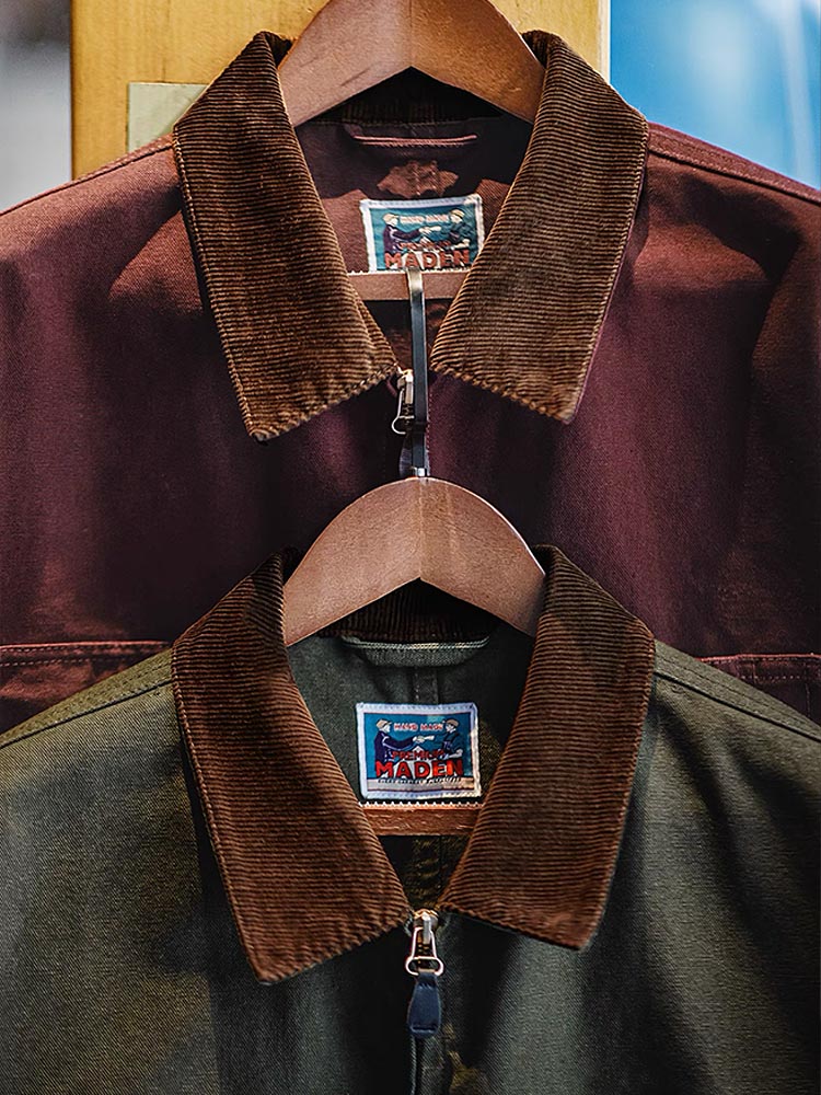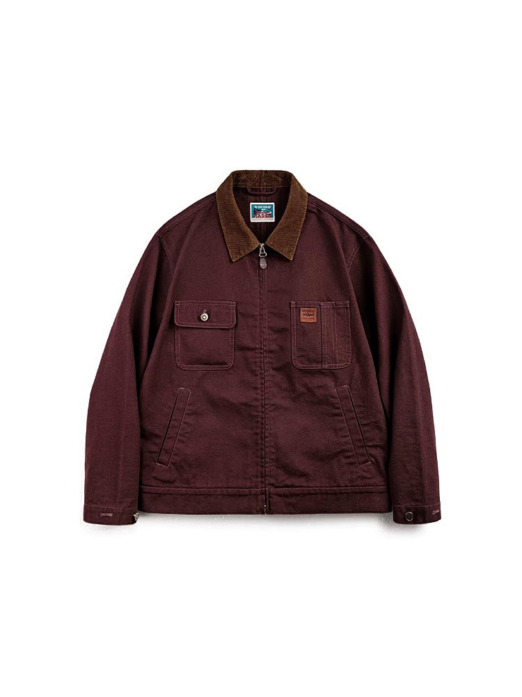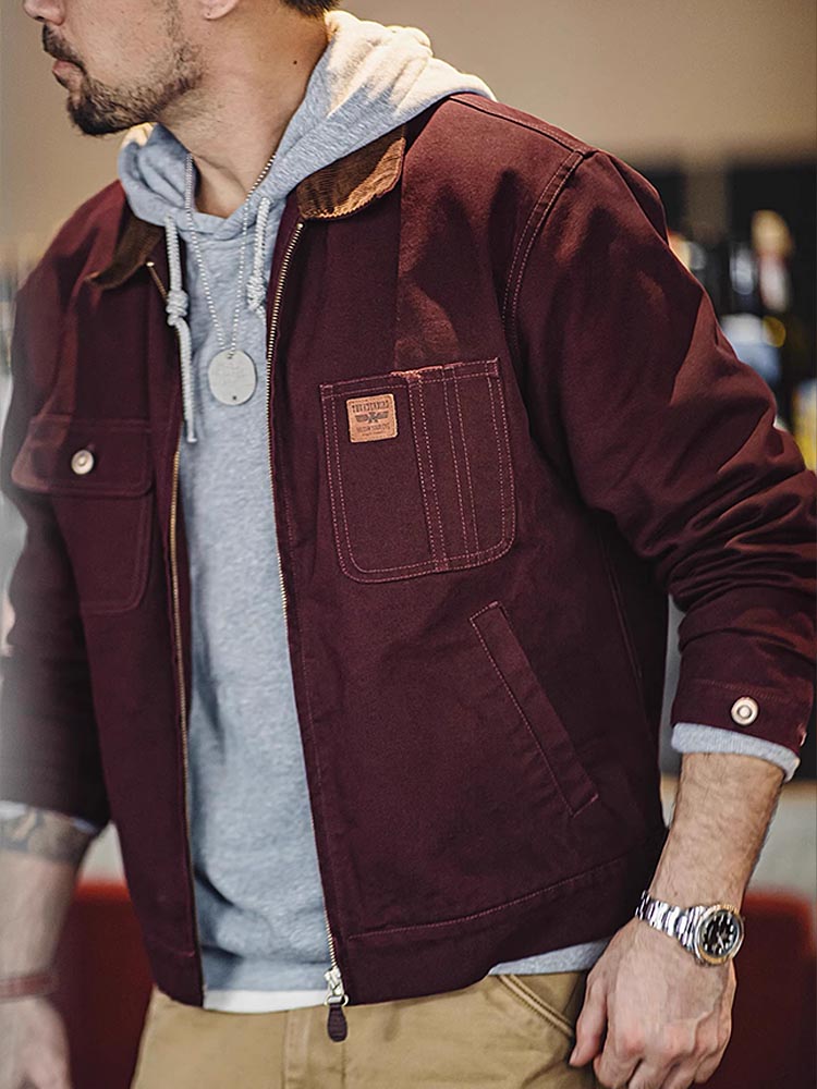Workwear jacket with contrast corduroy collar. Available in Wine Red & Army Green.