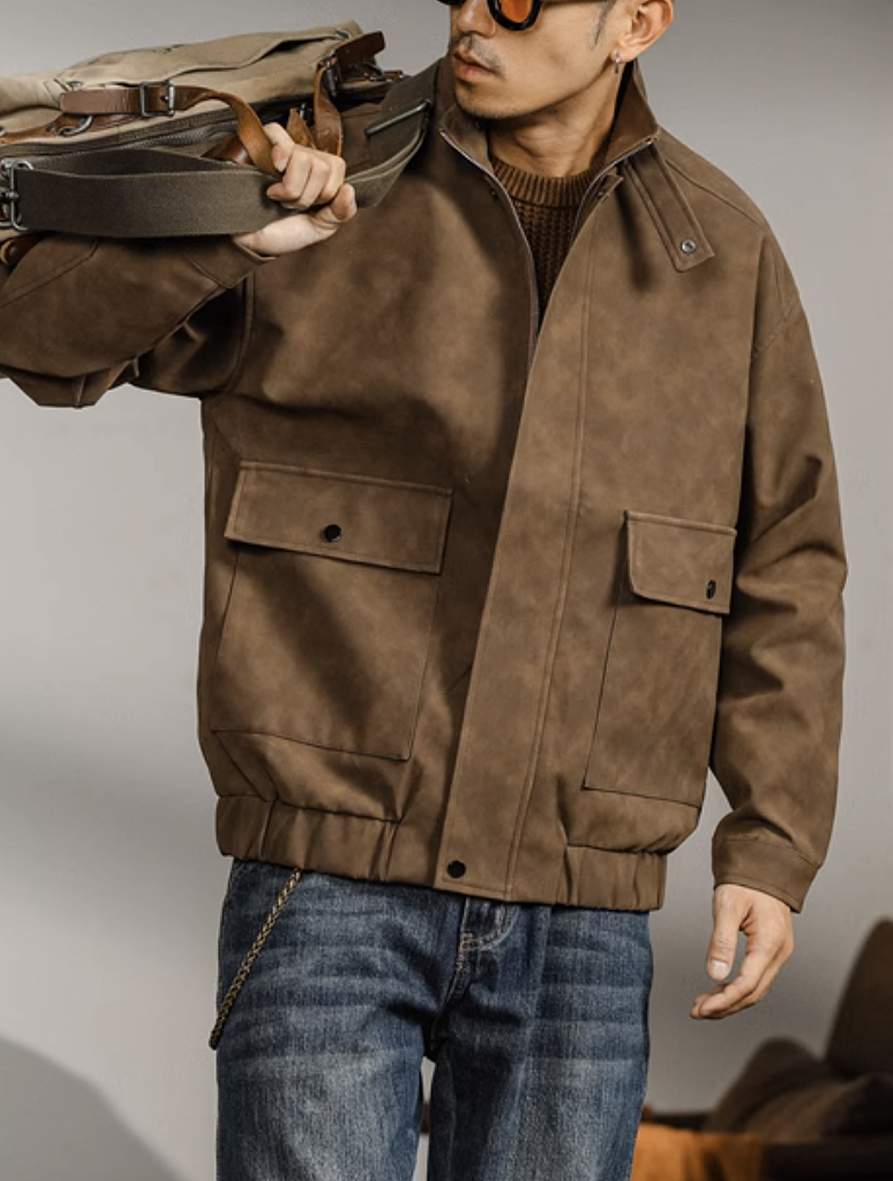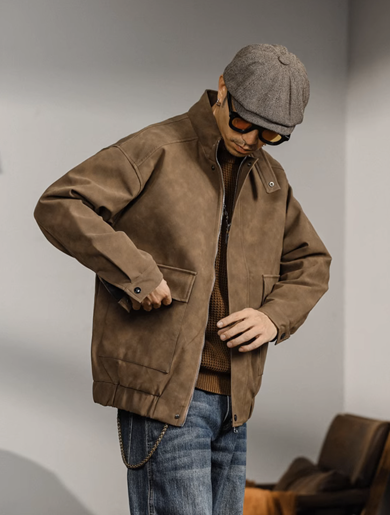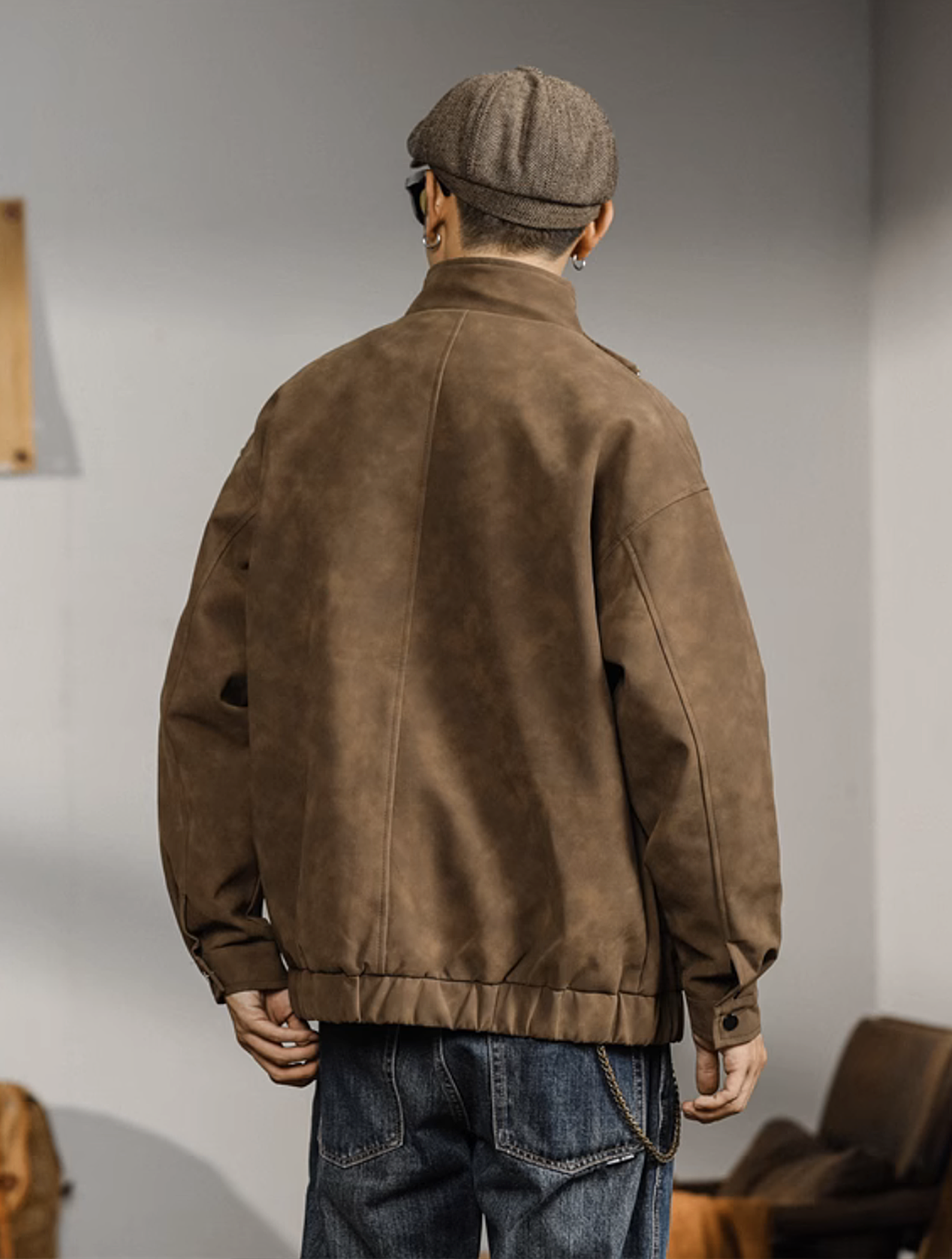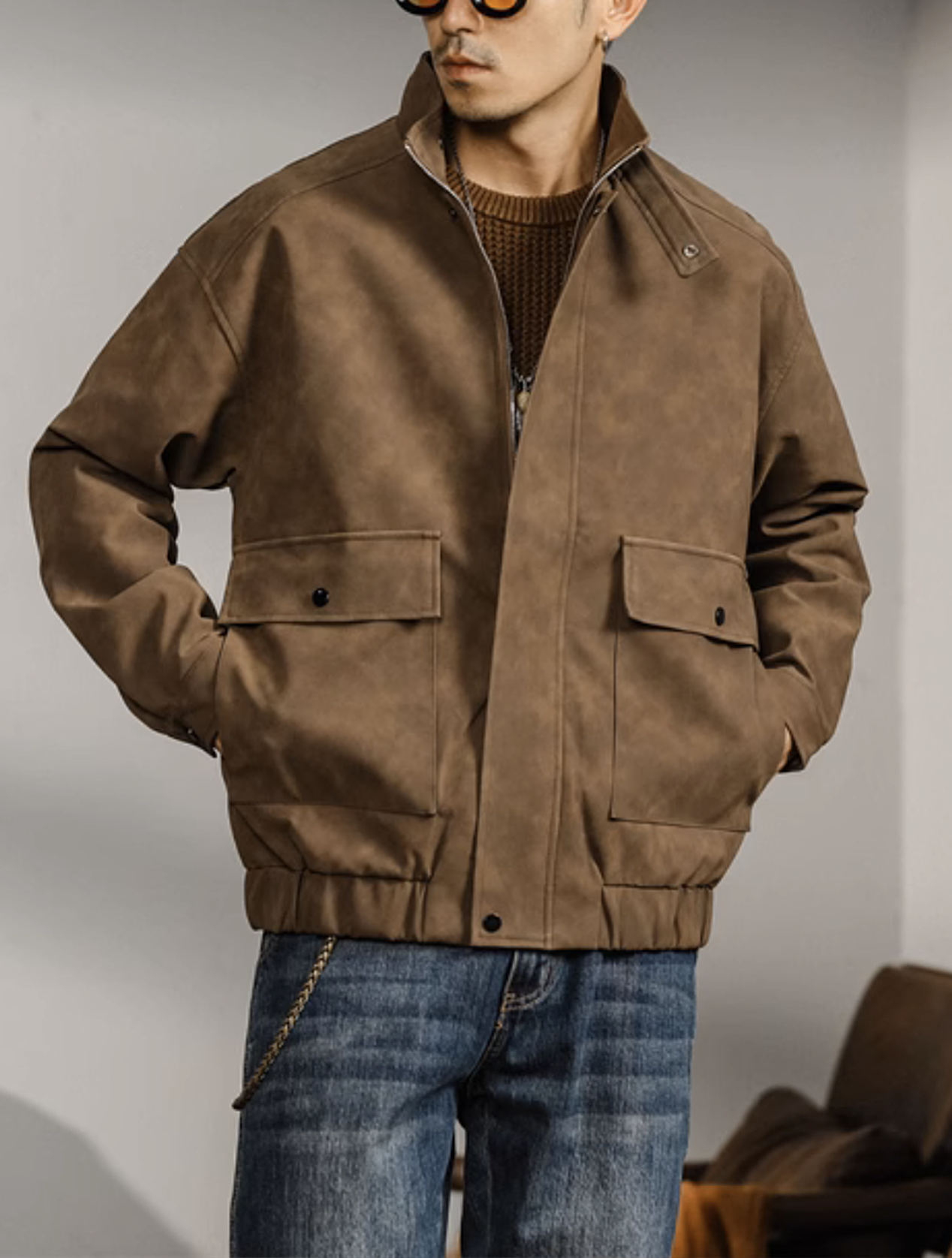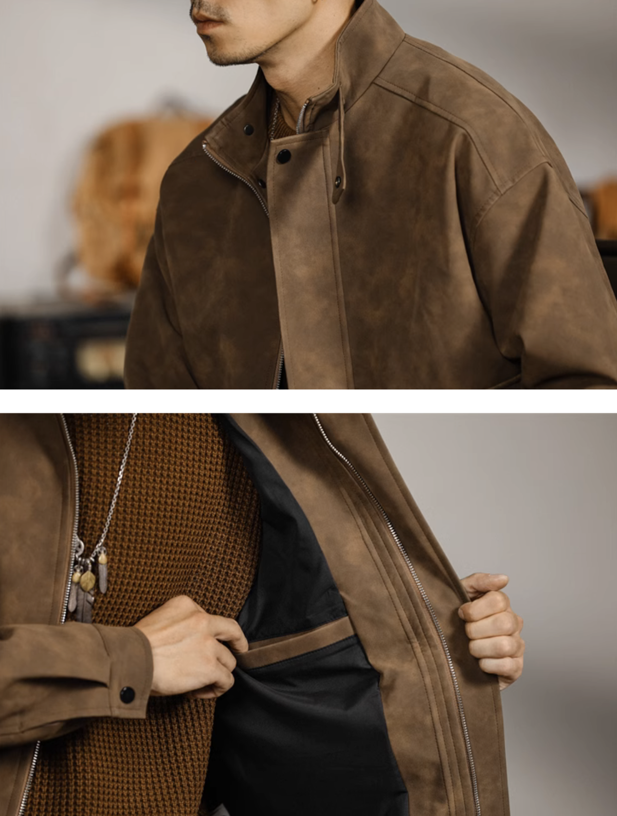 Smart casual jacket in PU fabric. Available in Coffee and Black.