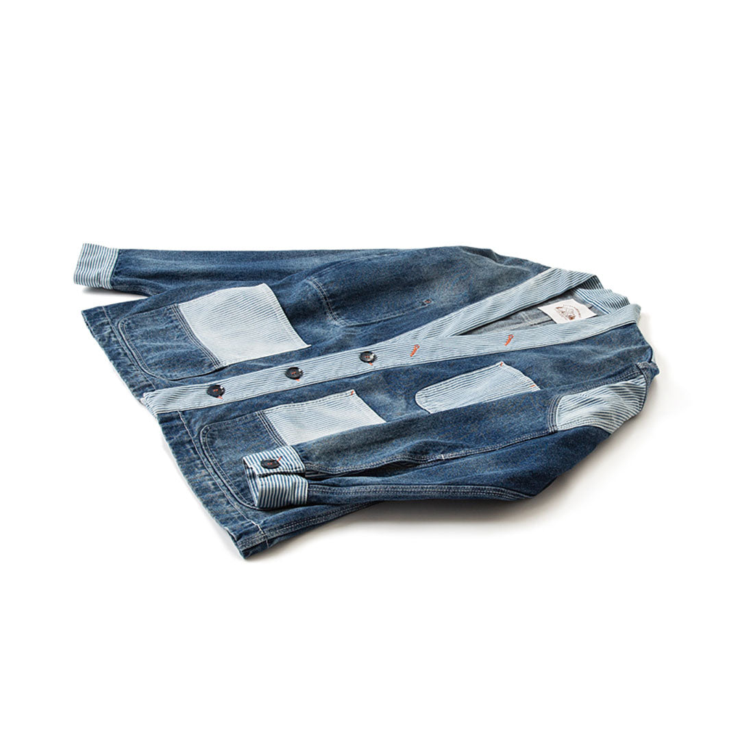 Functional patchwork denim jacket with kimono shawl collar detail in contrast fabrics.