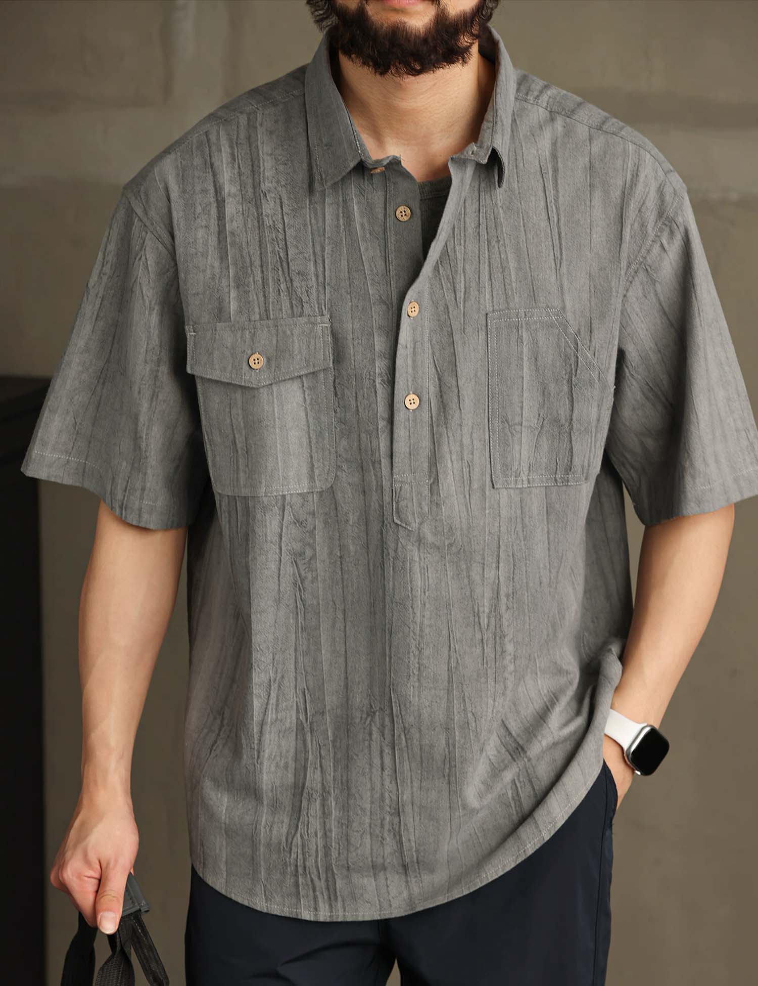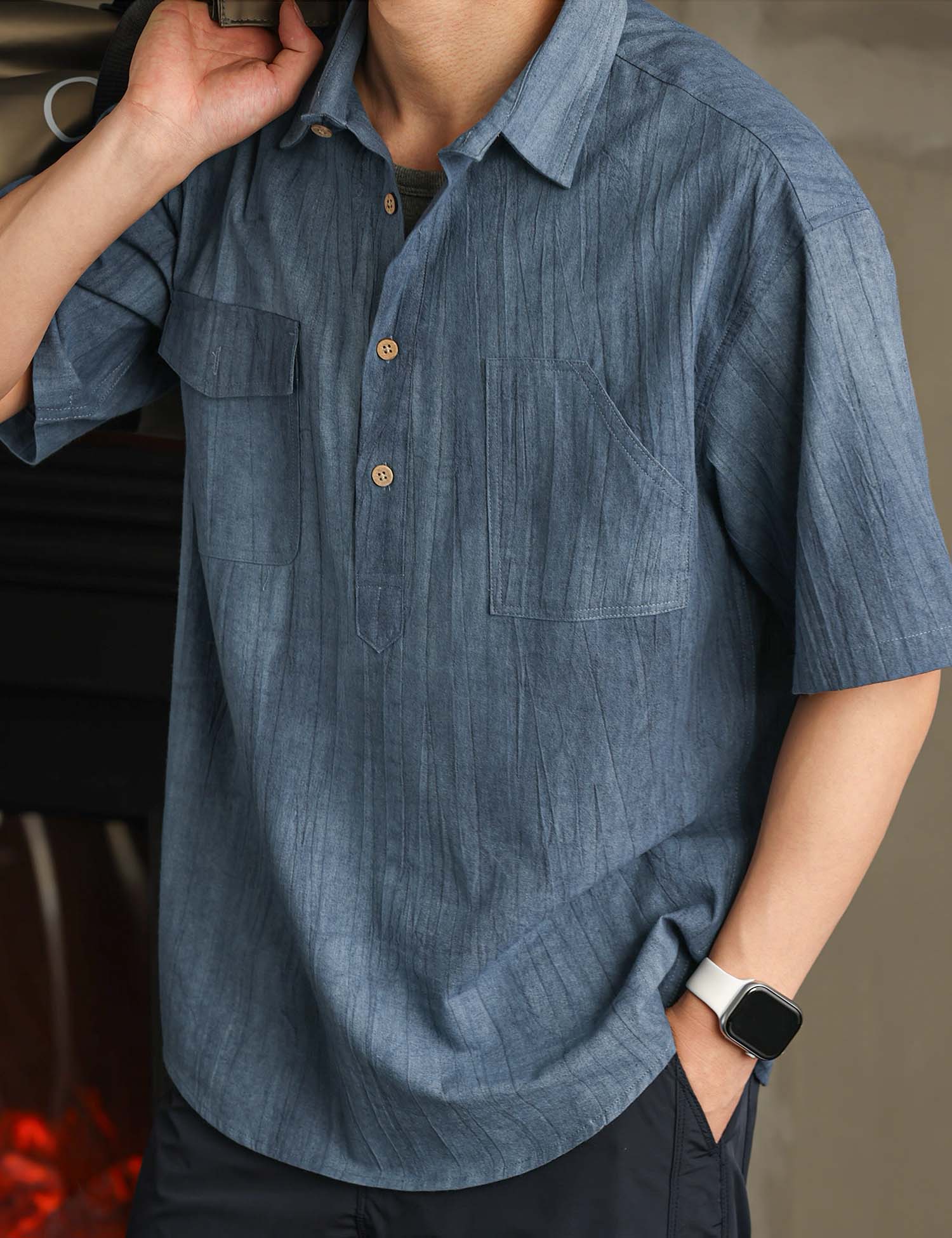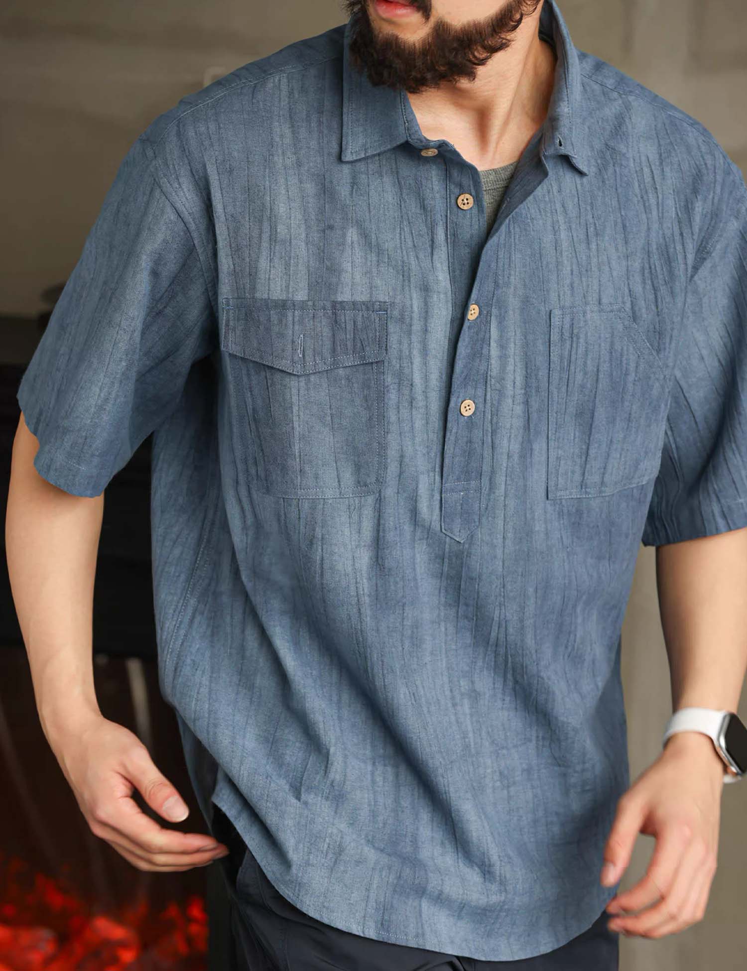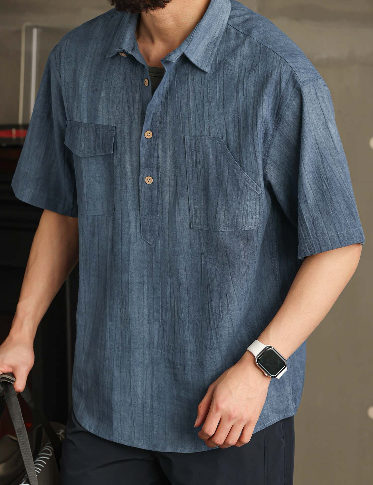 Smart casual short-sleeved shirt with in cool textured cotton ramie fabric.