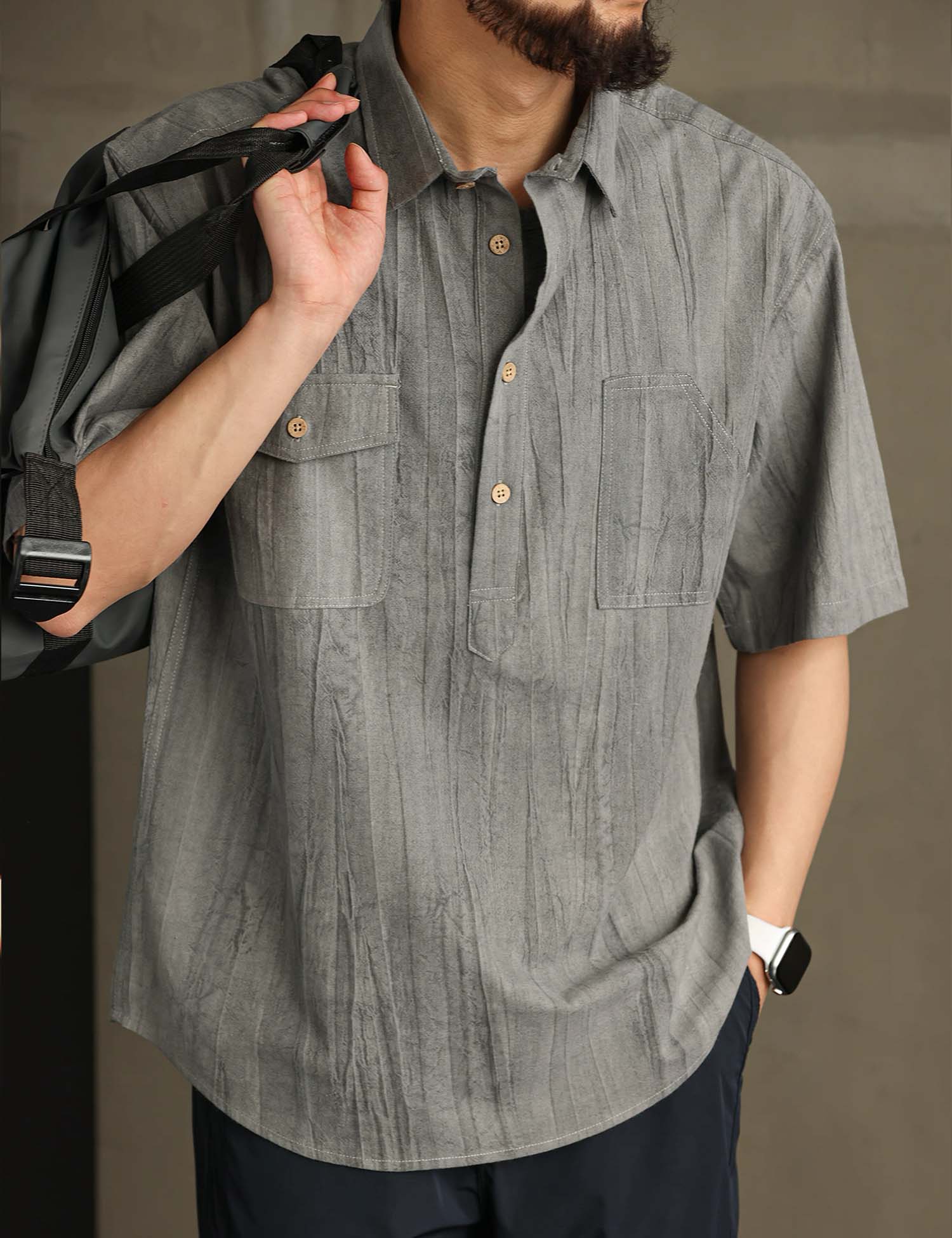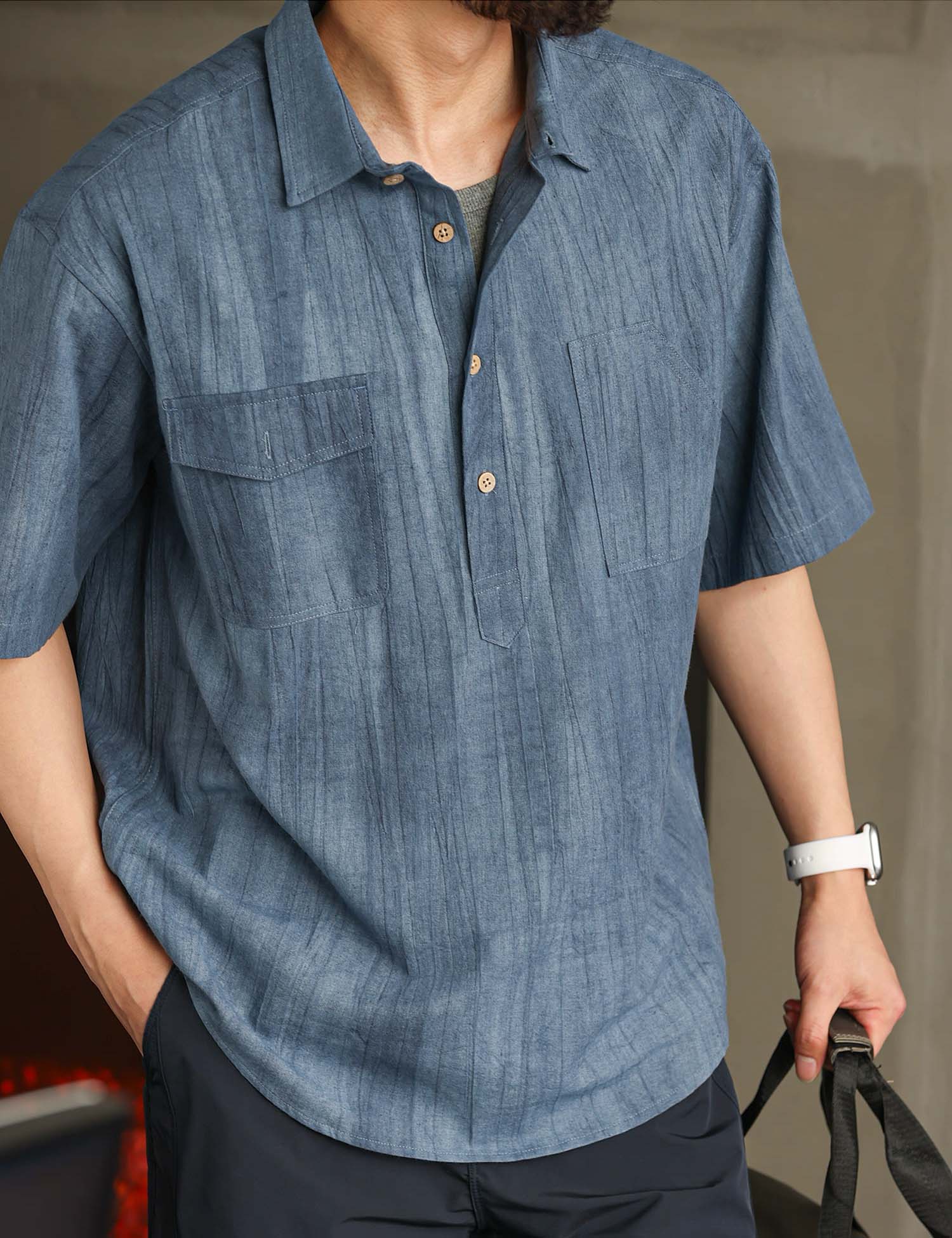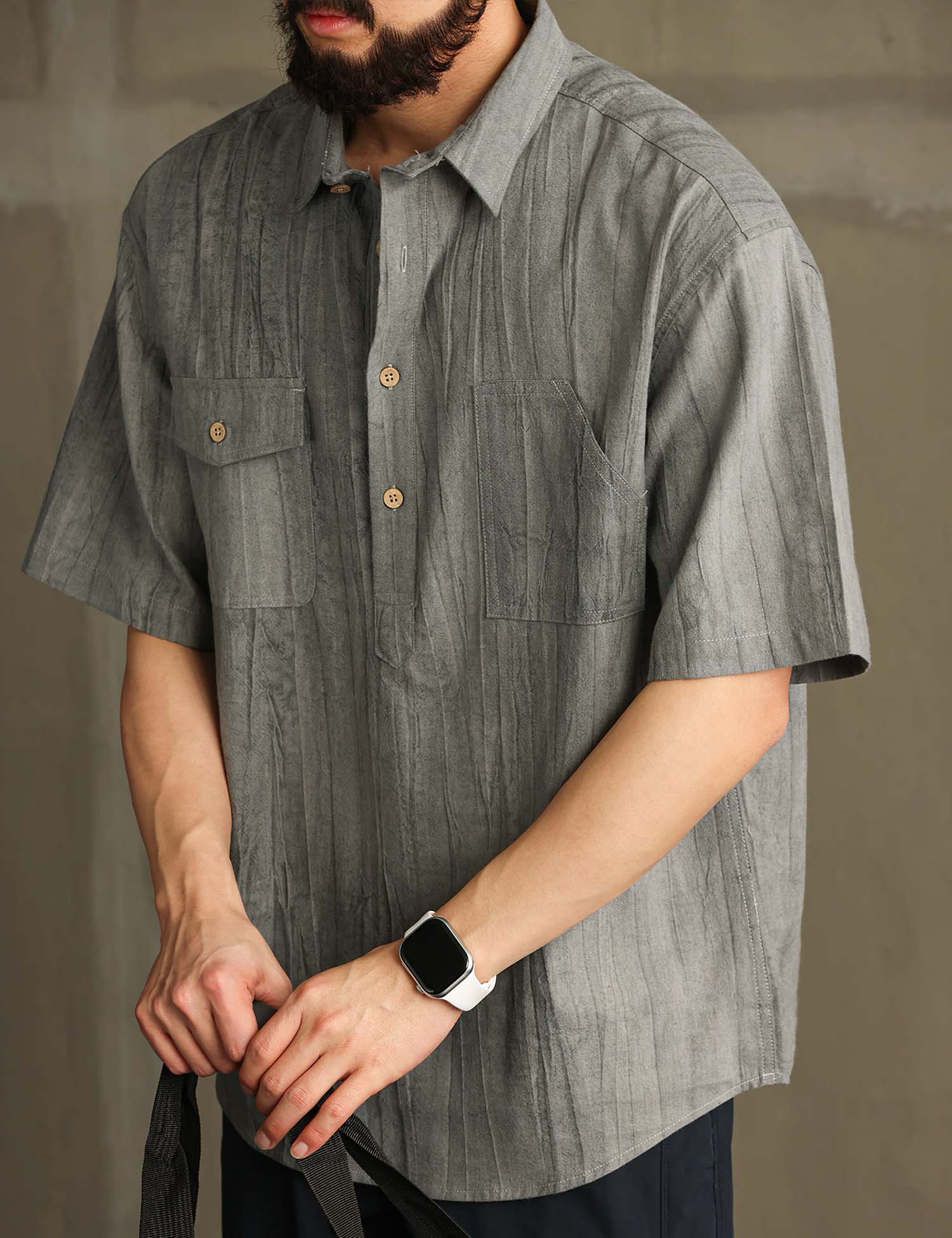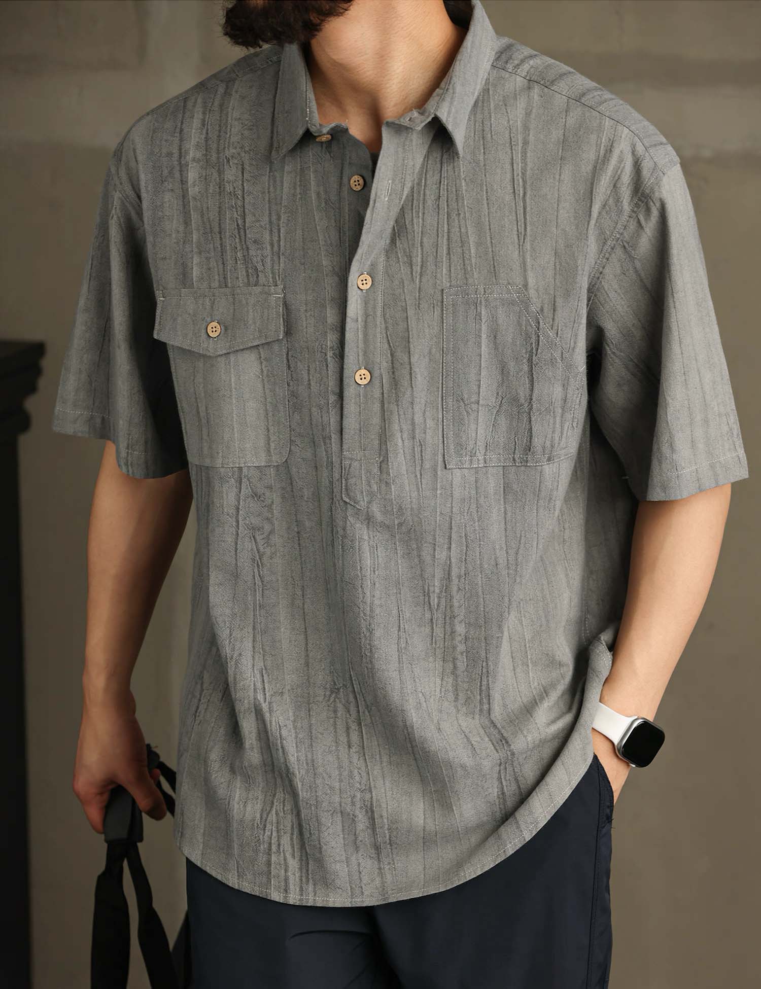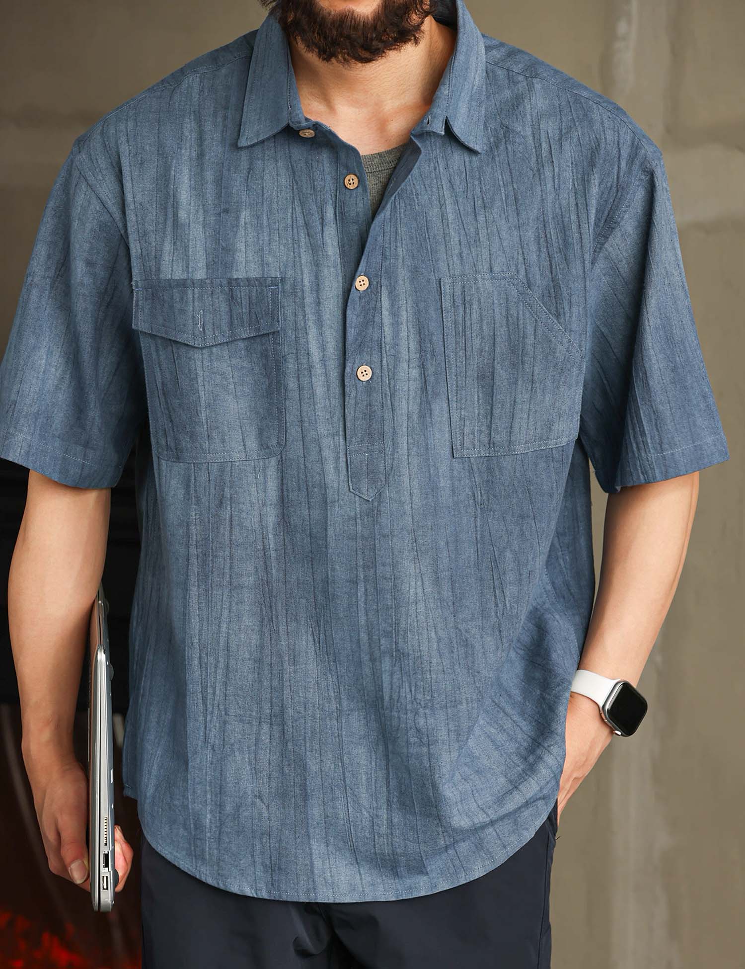 Smart casual short-sleeved shirt with in cool textured cotton ramie fabric.
