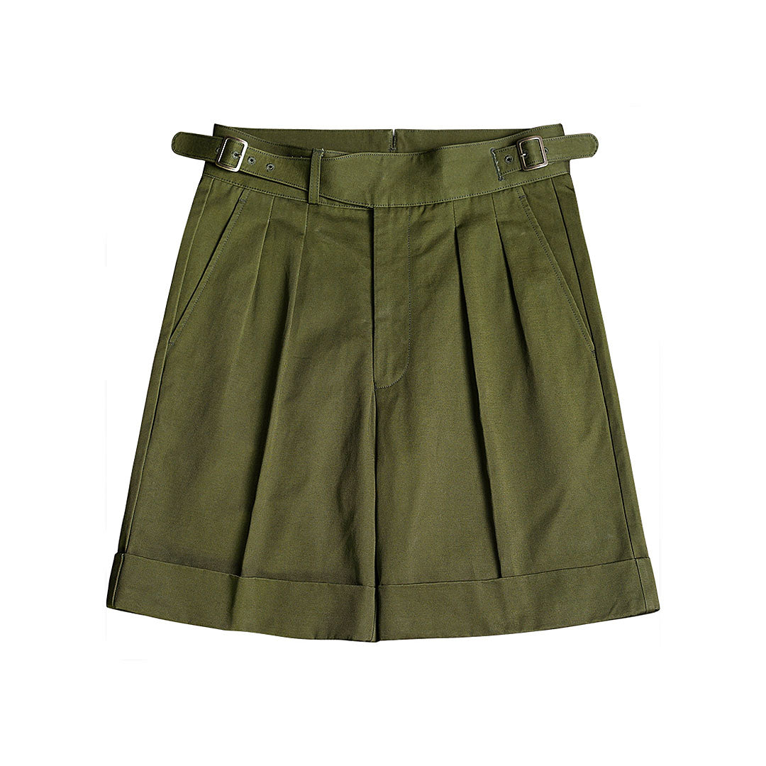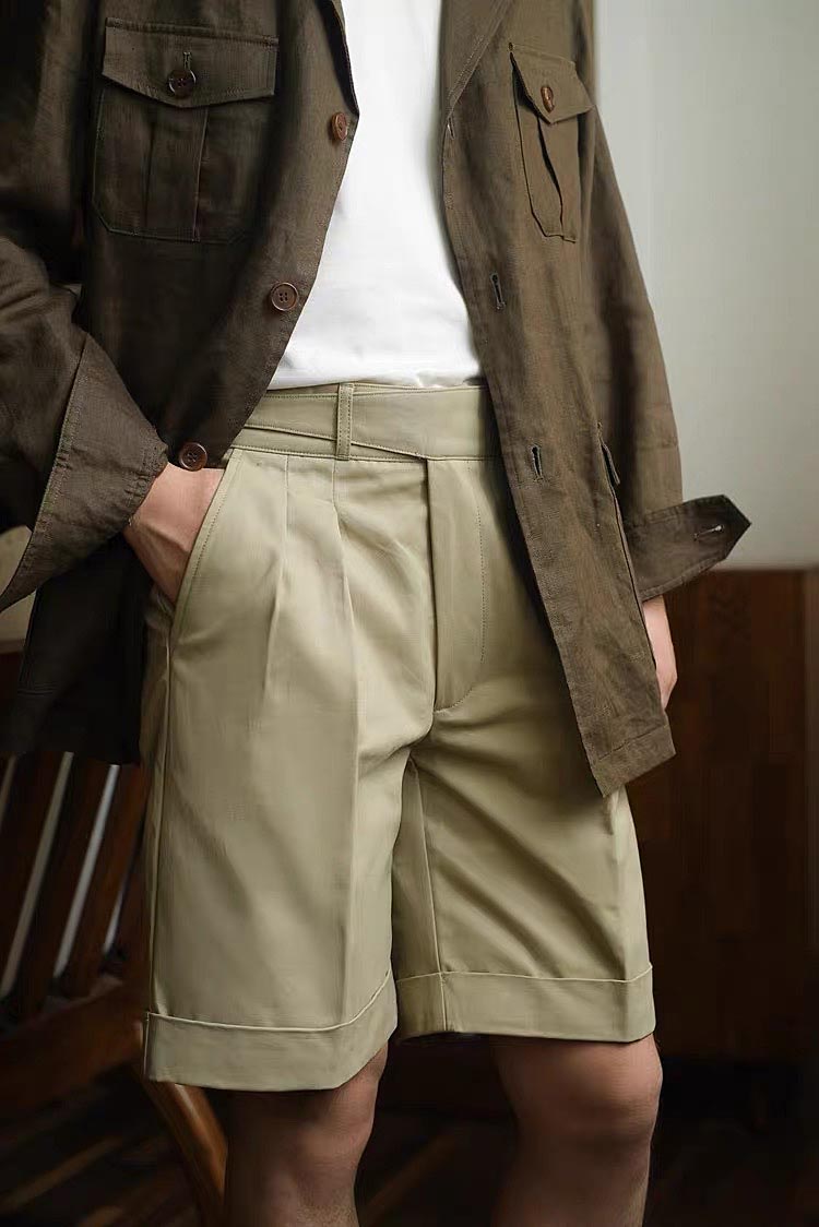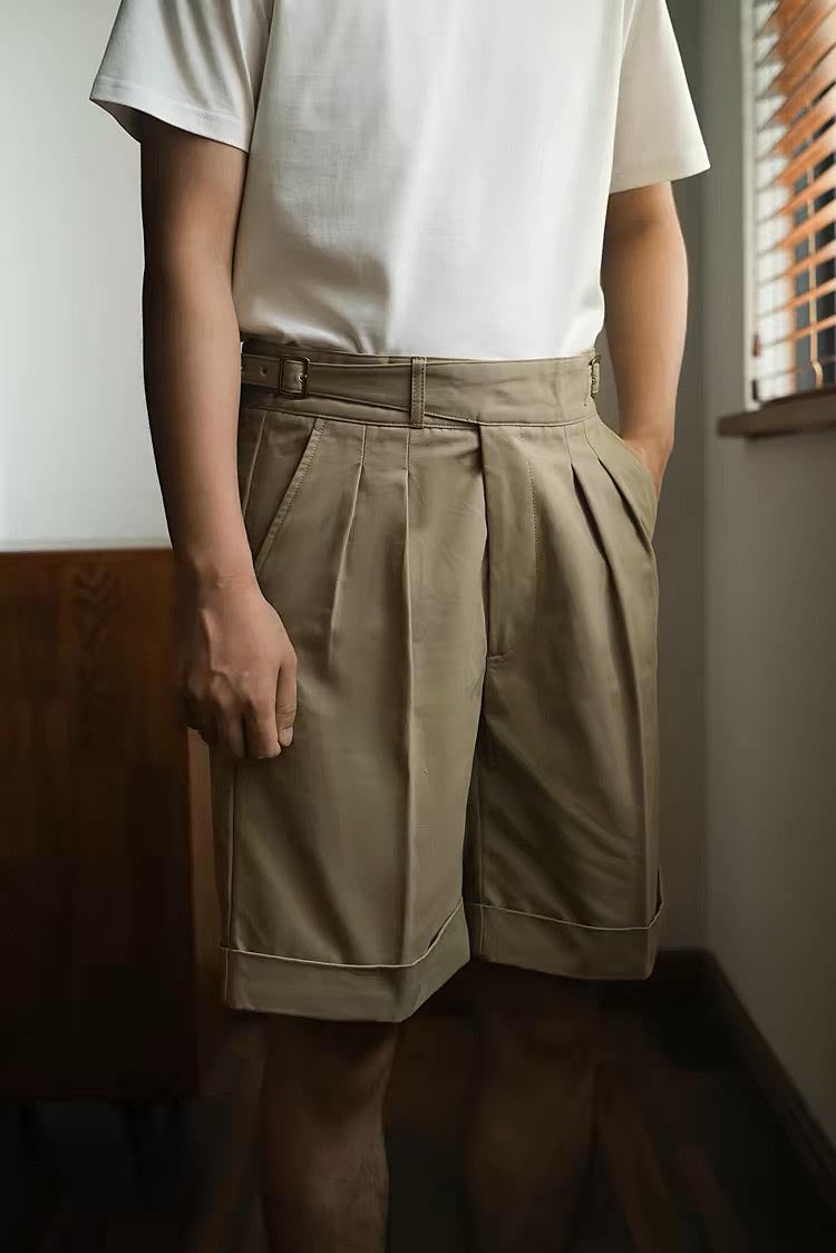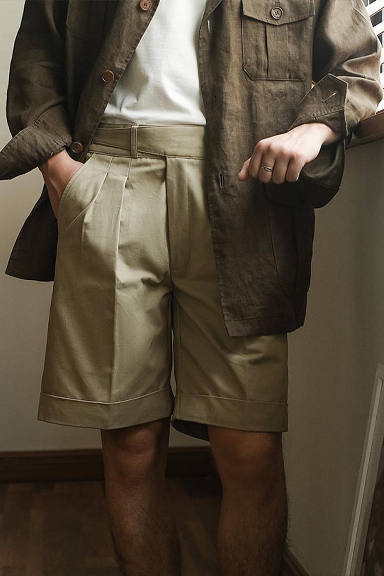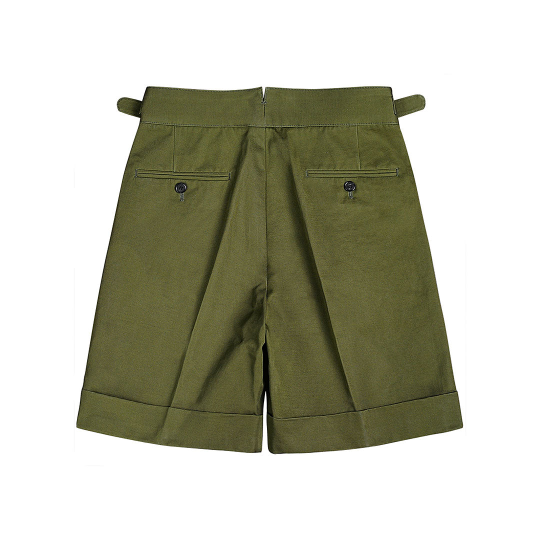 Workwear Gurkha shorts designed with front pleats which allows ease and comfort. Slightly adjustable at waist finished with folded cuff hem.